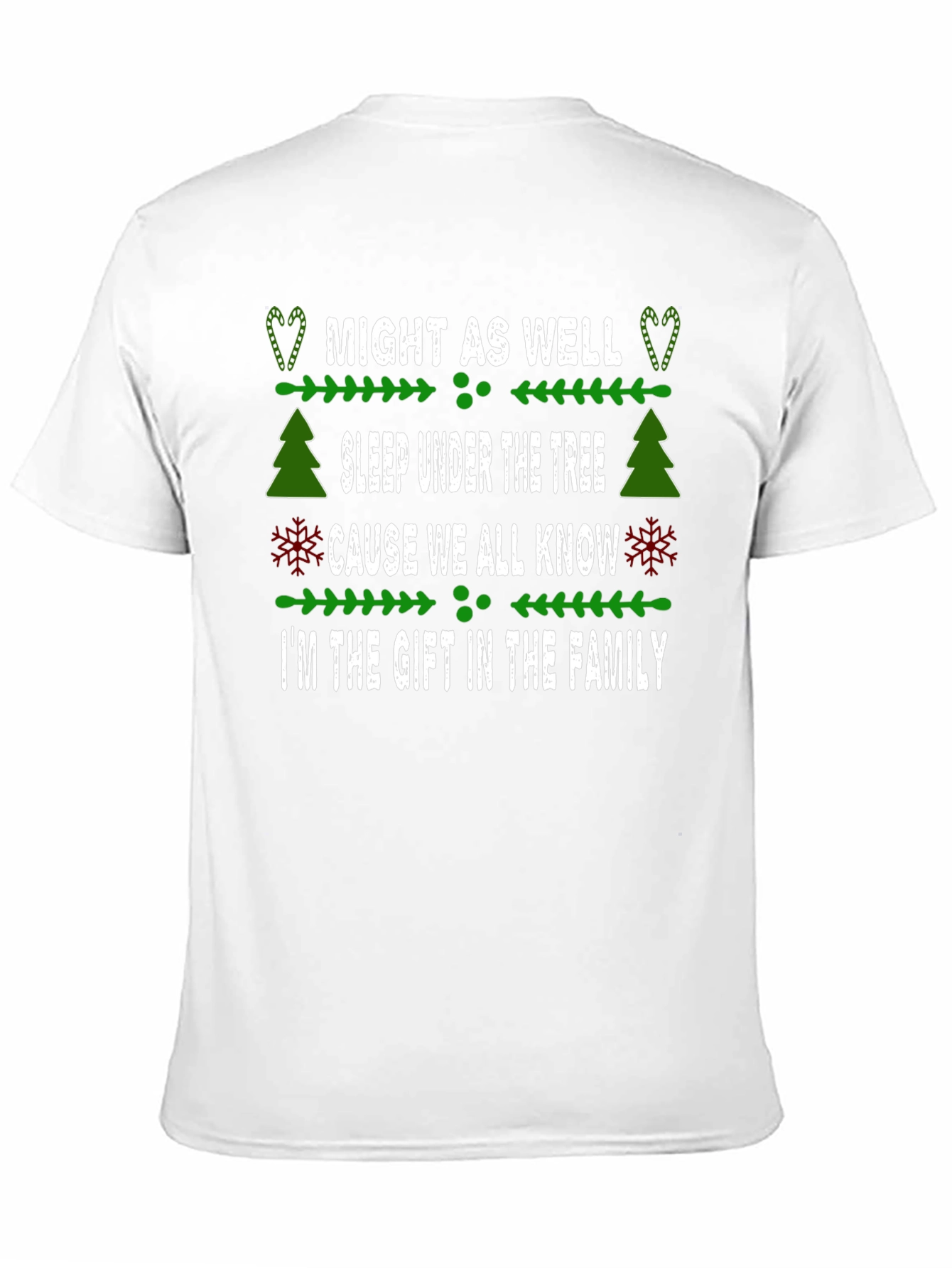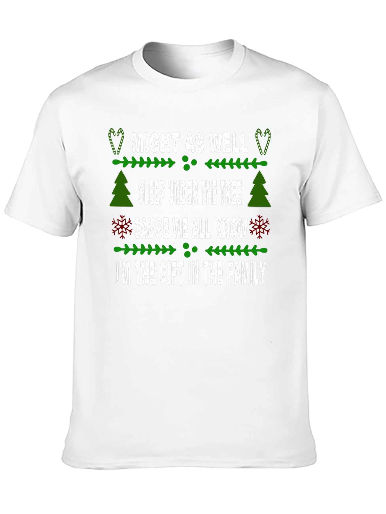 Spread holiday cheer with this hilarious Christmas T-shirt. The design features festive elements like candy canes, Christmas trees, and snowflakes, framing the witty text: "MIGHT AS WELL SLEEP UNDER THE TREE CAUSE WE ALL KNOW I'M THE GIFT IN THE FAMILY." Made from a comfortable black fabric, this tee is perfect for holiday parties, family gatherings, or cozy nights in. Show off your sense of humor and be the highlight of the holiday season with this unique and eye-catching T-shirt.