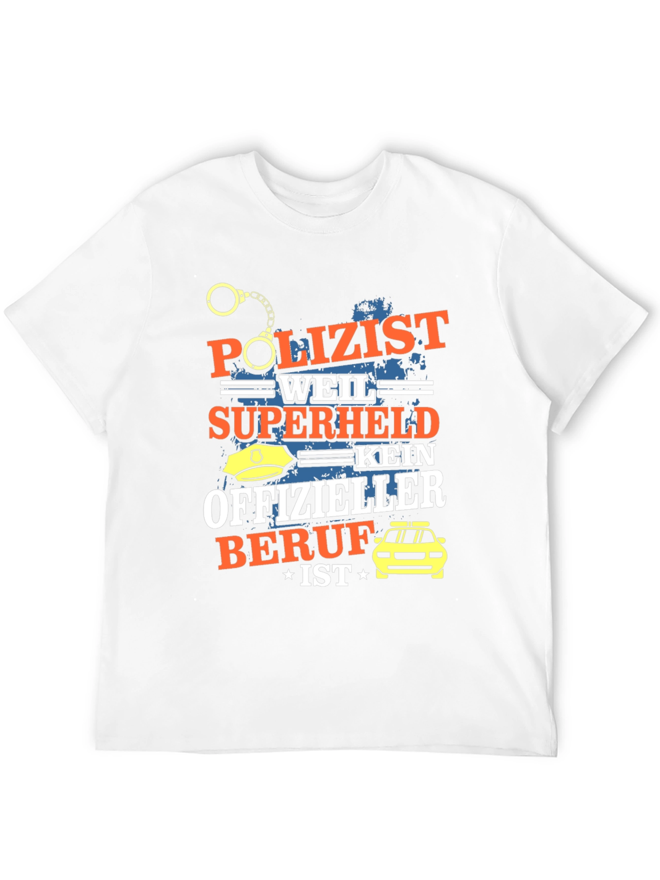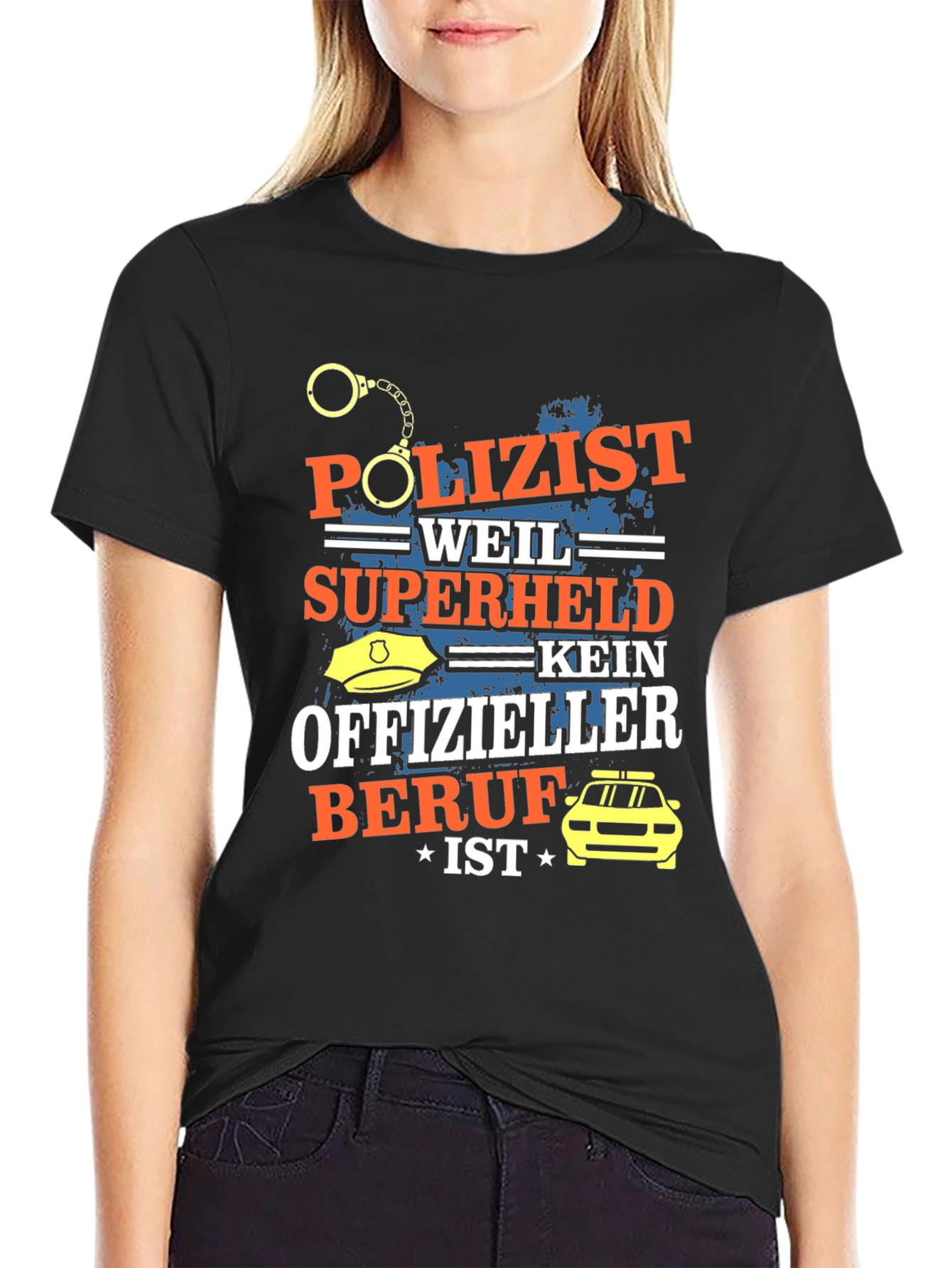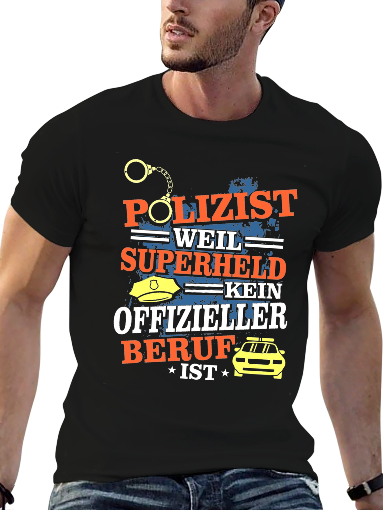 This eye-catching black t-shirt features a bold, humorous design for German police officers. The print displays the text "Polizist Weil Superheld Kein Offizieller Beruf Ist", which roughly translates to "Police Officer Because Superhero Isn't An Official Job." Above the text is an image of handcuffs and a police cap is shown in the middle of the text. At the bottom of the design is a police car. The design makes it a great way for German police officers to display their sense of humor. It's perfect for casual wear, police events, or as a gag gift for your favorite officer. Made from comfortable fabric for everyday wear.