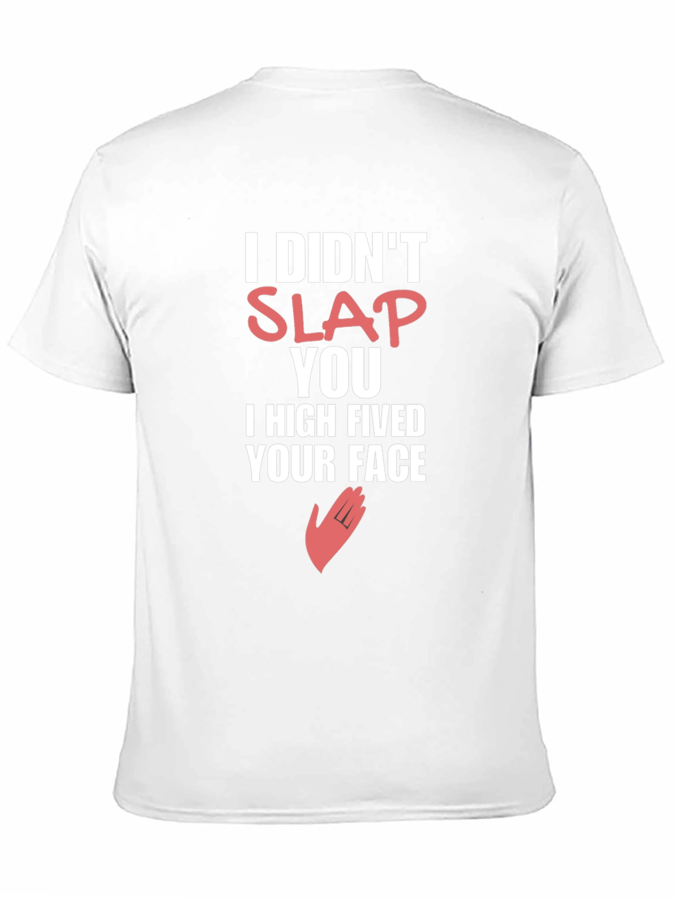 Make a statement with this bold black graphic tee. Featuring the humorous phrase 'I DIDN'T SLAP YOU I HIGH FIVED YOUR FACE' in eye-catching white and coral font, along with a hand graphic, this shirt is sure to turn heads. Ideal for casual wear, parties, or as a gift for those with a sense of humor. Made from comfortable materials, this t-shirt offers a relaxed fit perfect for everyday wear. Express your unique style with this standout piece.