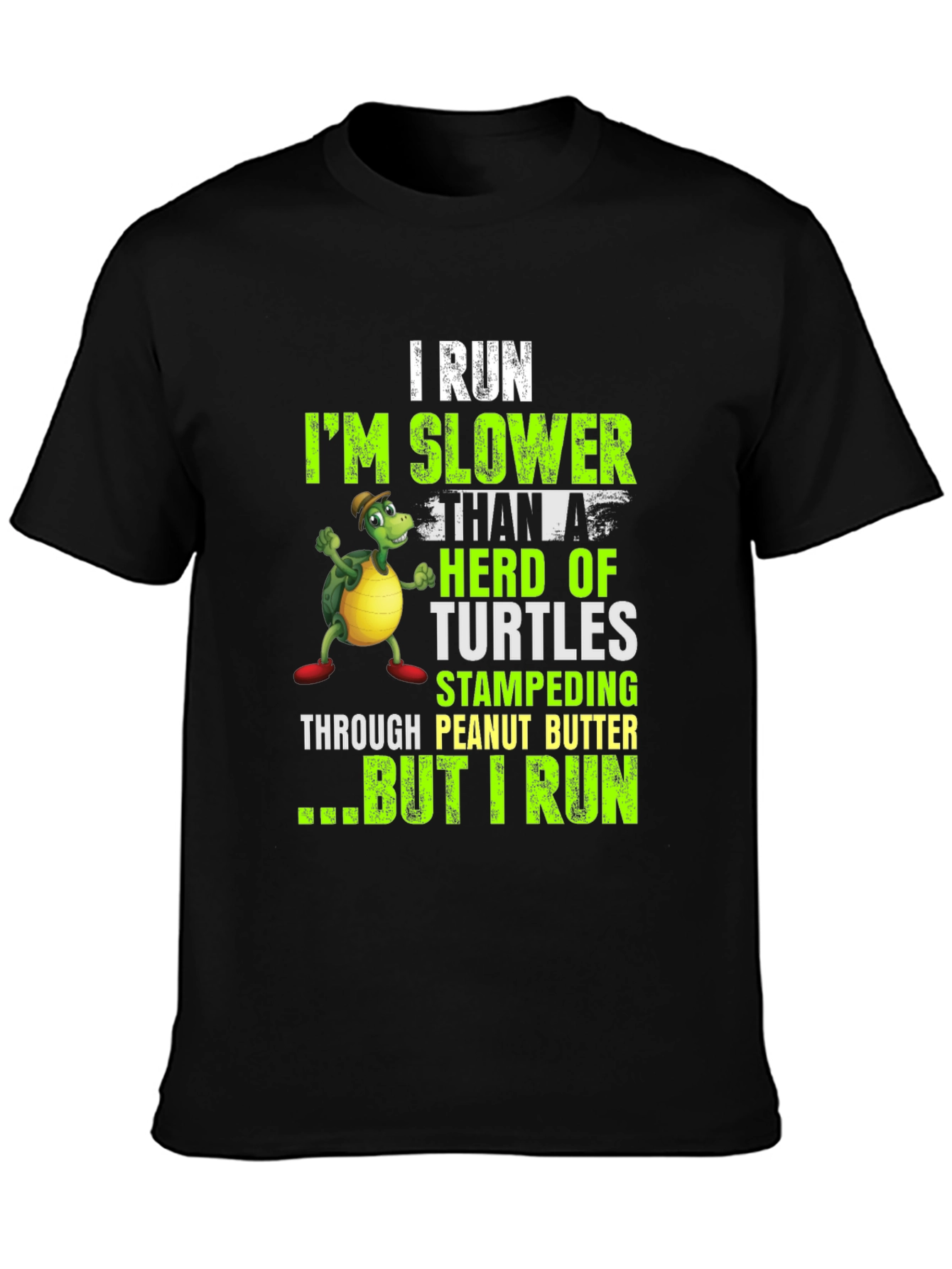 This humorous black t-shirt features a vibrant graphic design, perfect for those with a self-deprecating sense of humor about their running speed. The print includes a cartoon turtle and the witty saying "I run I'm slower than a herd of turtles stampeding through peanut butter...but I run." Made from a comfortable-looking fabric, this tee is ideal for casual wear, gym sessions, or as a fun conversation starter. Show off your love for running, even if you're not the fastest, with this eye-catching and relatable t-shirt.