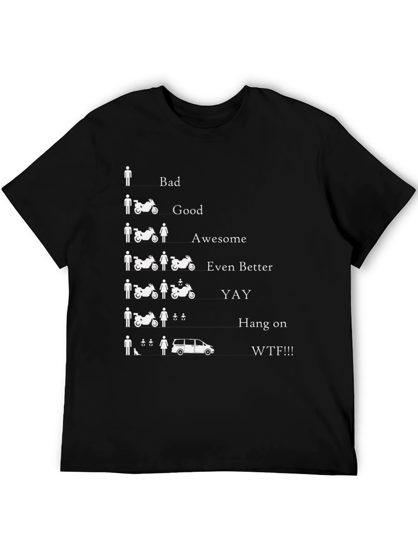 Show off your love for motorcycles with this humorous black t-shirt! Featuring a playful graphic depicting the evolution of a biker's life, from solo riding to family life in a minivan (WTF!!!). The design is printed in white on a soft, comfortable black fabric. This tee is perfect for casual wear, motorcycle events, or as a gift for the motorcycle enthusiast in your life. Express your unique sense of humor and biker spirit with this fun and relatable t-shirt. Get yours today and let the good times roll!