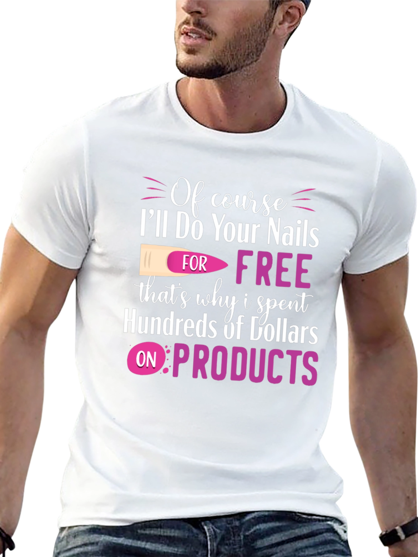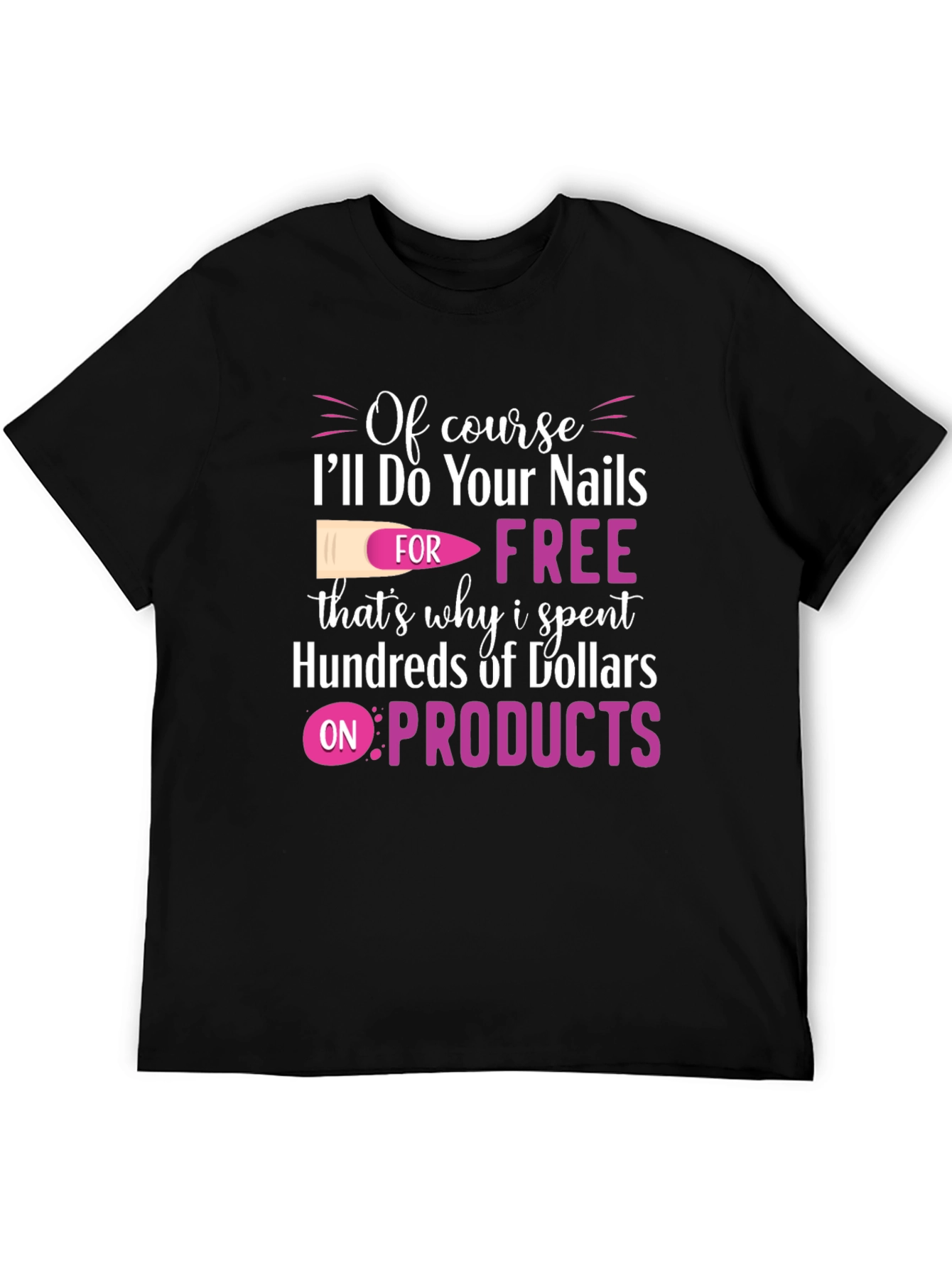 This humorous black t-shirt is perfect for nail technicians with a sense of humor. The design features the phrase "Of course, I'll Do Your Nails FOR FREE, that's why I spent Hundreds of Dollars on PRODUCTS" in a stylish pink and white font. A nail graphic is included within the design. This witty tee is a great conversation starter and a fun way to express your passion for nails. Made from comfortable materials, it's ideal for wearing at the salon, nail conventions, or casual outings. A perfect gift for the nail tech who has it all!