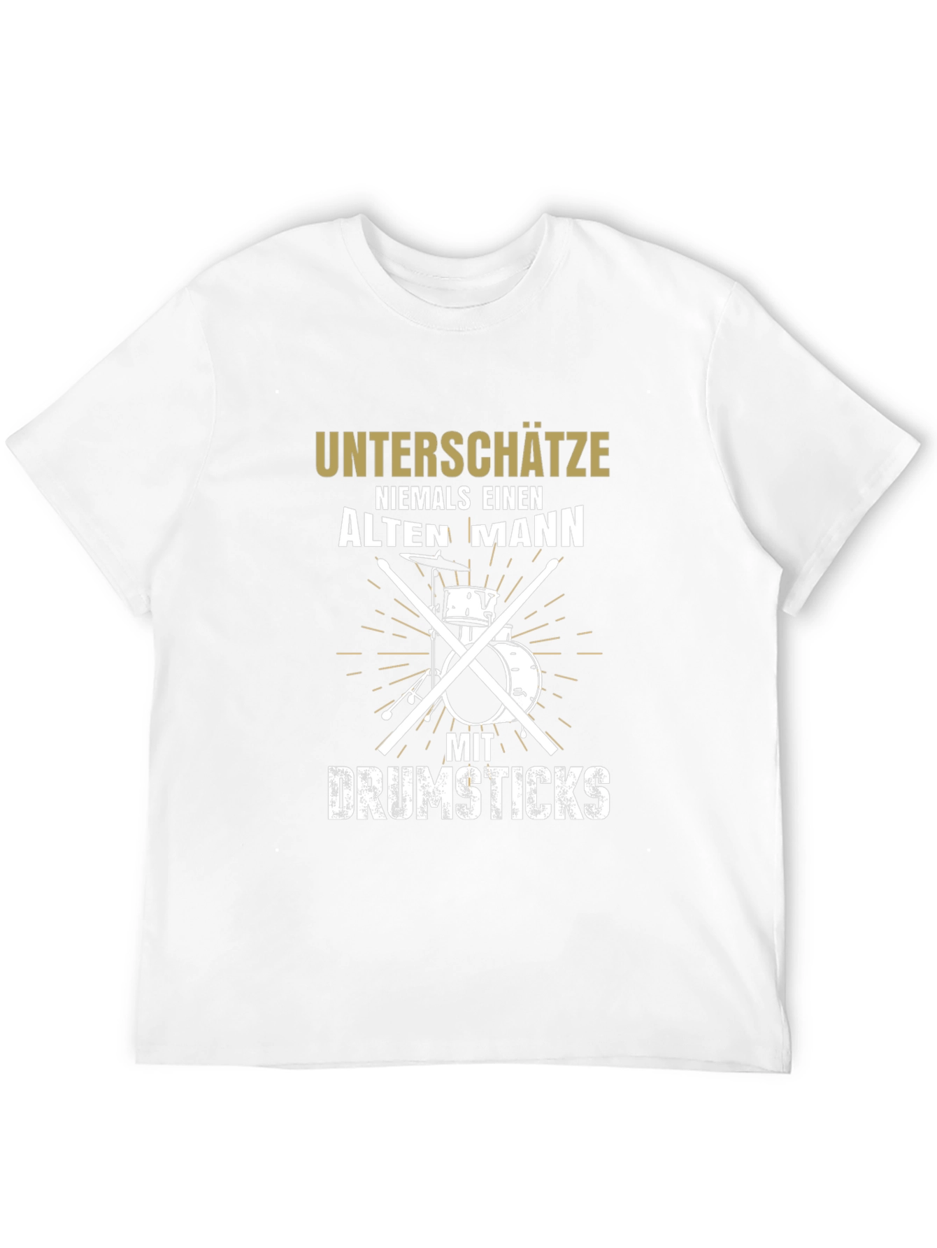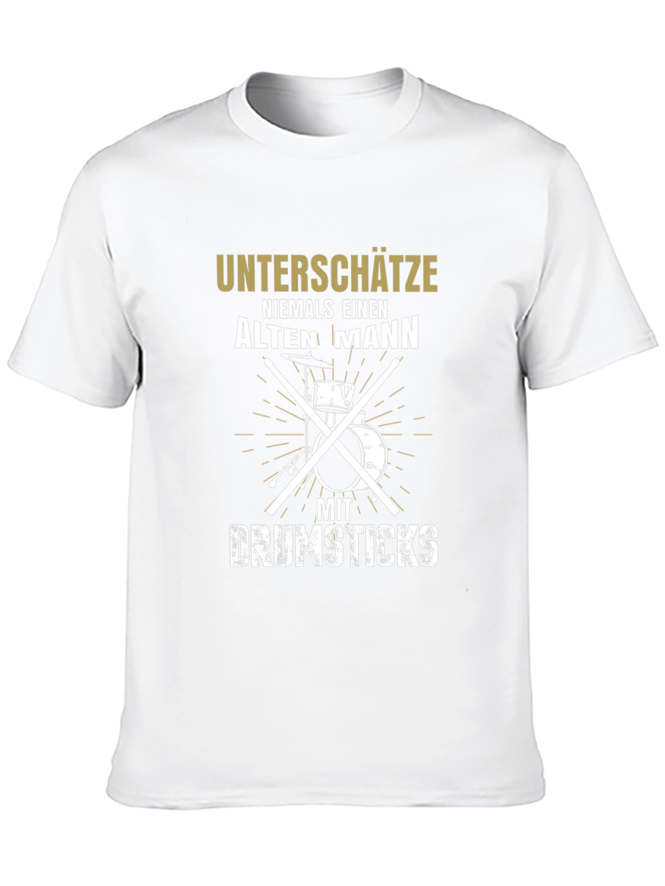 Showcase your musical passion with this striking black t-shirt. The shirt features a bold graphic design that reads 'Unterschätze niemals einen alten Mann mit Drumsticks,' meaning 'Never underestimate an old man with drumsticks.' The design also includes a drum set illustration with crossed drumsticks, perfect for drummers and music lovers alike. Made from comfortable material, this tee offers a relaxed fit suitable for everyday wear. Wear it to band practice, concerts, or casual outings to express your love for drumming. This unique t-shirt makes a great gift for the experienced drummer in your life!