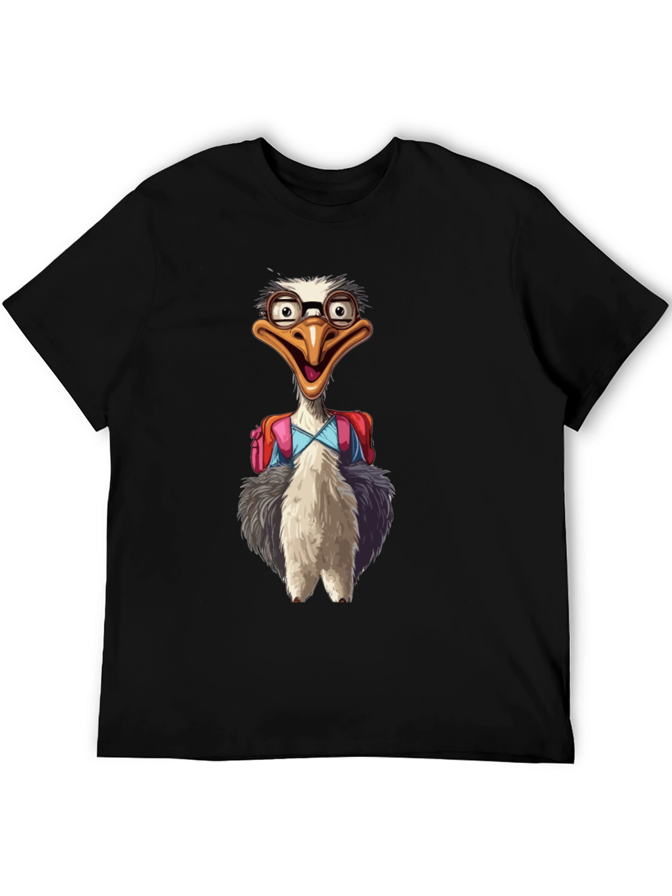 This black t-shirt features a whimsical graphic of an ostrich wearing glasses and a backpack. The cartoon bird is rendered in vibrant colors, with fluffy gray and white feathers and a quirky expression. The design suggests a fun back-to-school theme, perfect for those who enjoy unique and playful apparel. The shirt appears to be made of a soft, comfortable material ideal for everyday wear. It's a great way to showcase your love for animals and humor! This tee is ideal for casual outings, school events, or just lounging around in style.