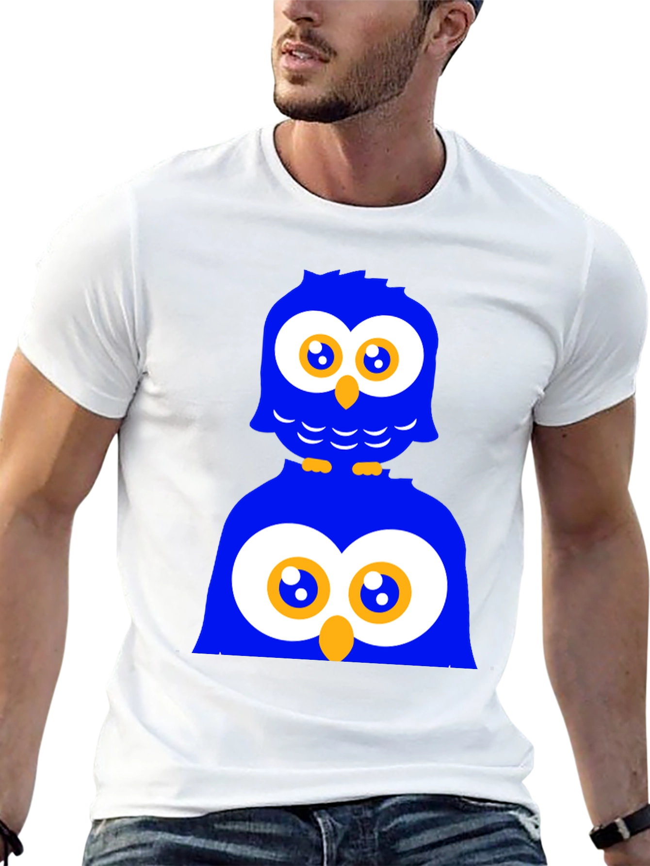 This black t-shirt features a playful, eye-catching design of two blue owls stacked on top of each other. The bold graphic print adds a touch of whimsy and personality to your everyday wardrobe. Made from a comfortable, breathable fabric, this tee is perfect for casual wear. Pair it with jeans, shorts, or leggings for a fun and stylish look. The unique owl design makes it a great conversation starter and a fun gift for owl lovers! Show off your quirky side with this must-have graphic tee.