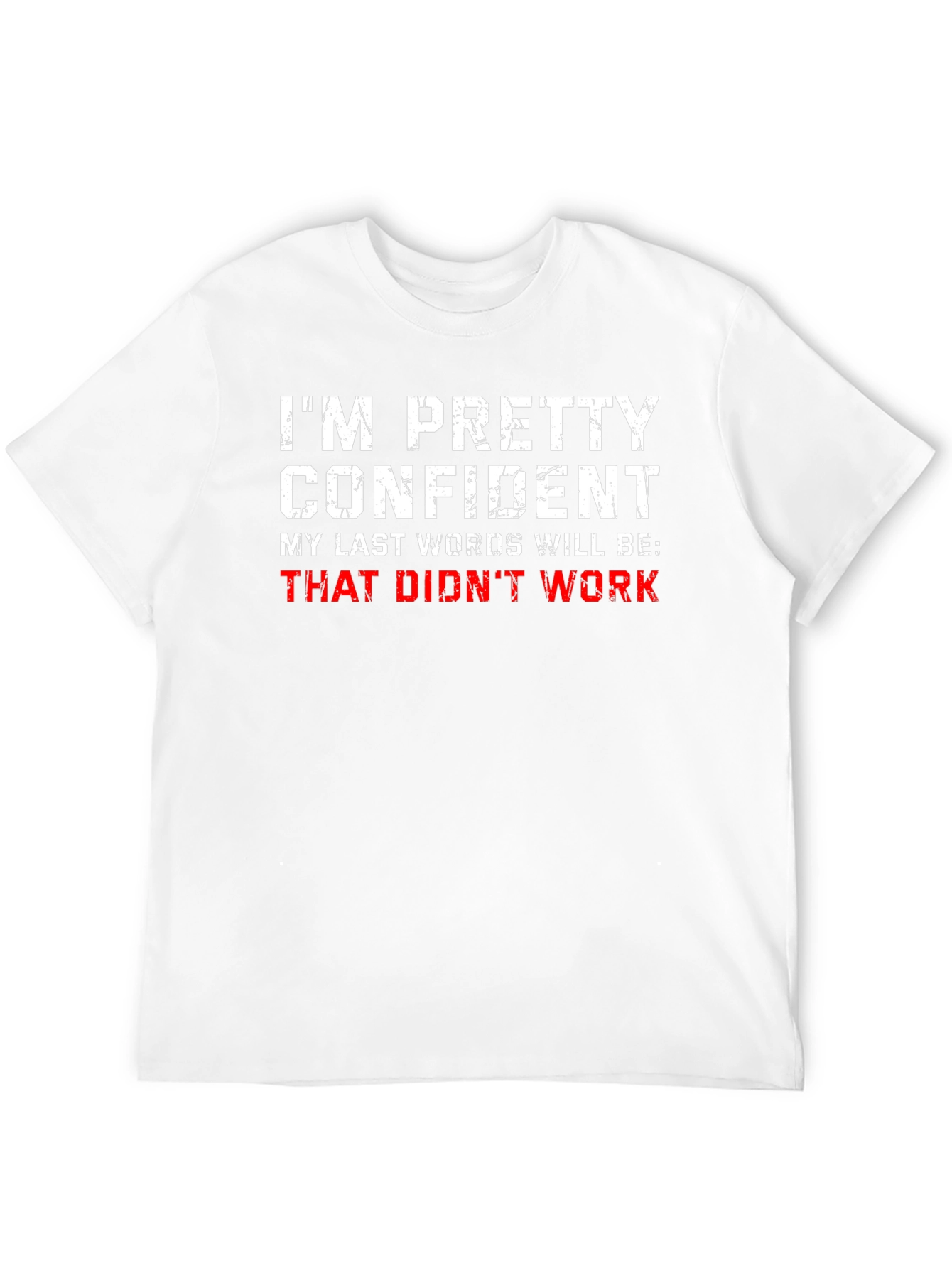 Express your quirky sense of humor with this eye-catching black t-shirt. The bold white lettering declares "I'm Pretty Confident," followed by the humorous red text: "That Didn't Work." This comfortable, short-sleeved tee is perfect for casual wear, parties, or as a conversation starter. Crafted from a soft, breathable fabric, this shirt offers both style and comfort. Whether you're known for your wit or just appreciate a good laugh, this t-shirt is a must-have addition to your wardrobe. Show off your confidence (or lack thereof) in a lighthearted way. Great for everyday wear!