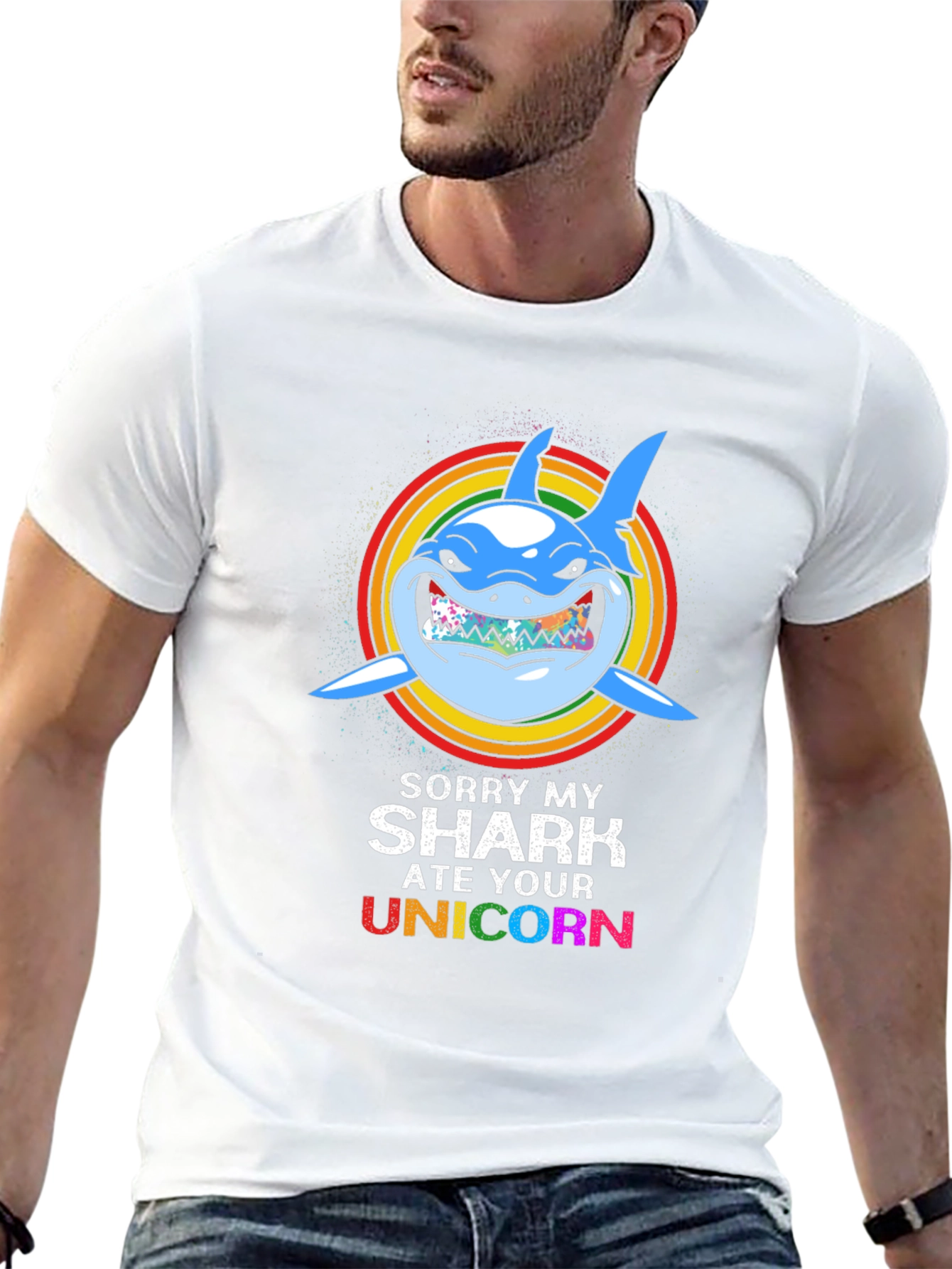 This cool black t-shirt features a cartoon shark graphic with a rainbow halo and the humorous text "Sorry My Shark Ate Your Unicorn". The playful design and vibrant colors make it a fun statement piece. It appears to be made from soft, comfortable fabric and has a classic short-sleeve cut. Great for casual wear, parties, or as a unique gift for shark and unicorn lovers with a sense of humor. Show off your quirky side with this eye-catching tee!