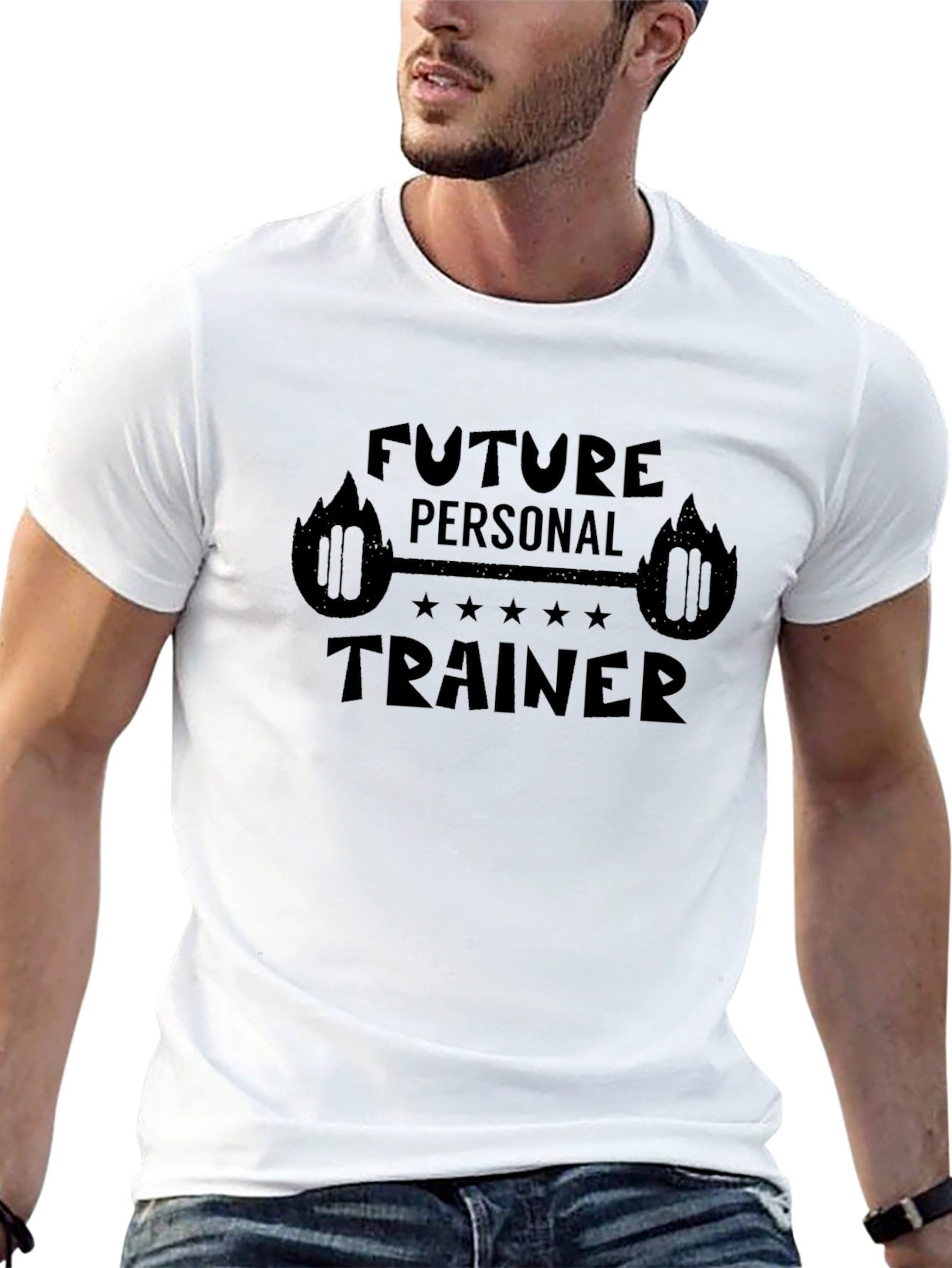 Show off your passion with this stylish black t-shirt featuring a bold "Future Personal Trainer" graphic. The design incorporates a barbell with flames and five stars, creating a dynamic and motivational look. Made from a comfortable fabric blend, this tee is perfect for workouts, casual wear, or as a gift for aspiring fitness professionals. The classic fit ensures a relaxed and flattering silhouette. Wear it to the gym, running errands, or simply lounging at home. Express your fitness goals with confidence and style!