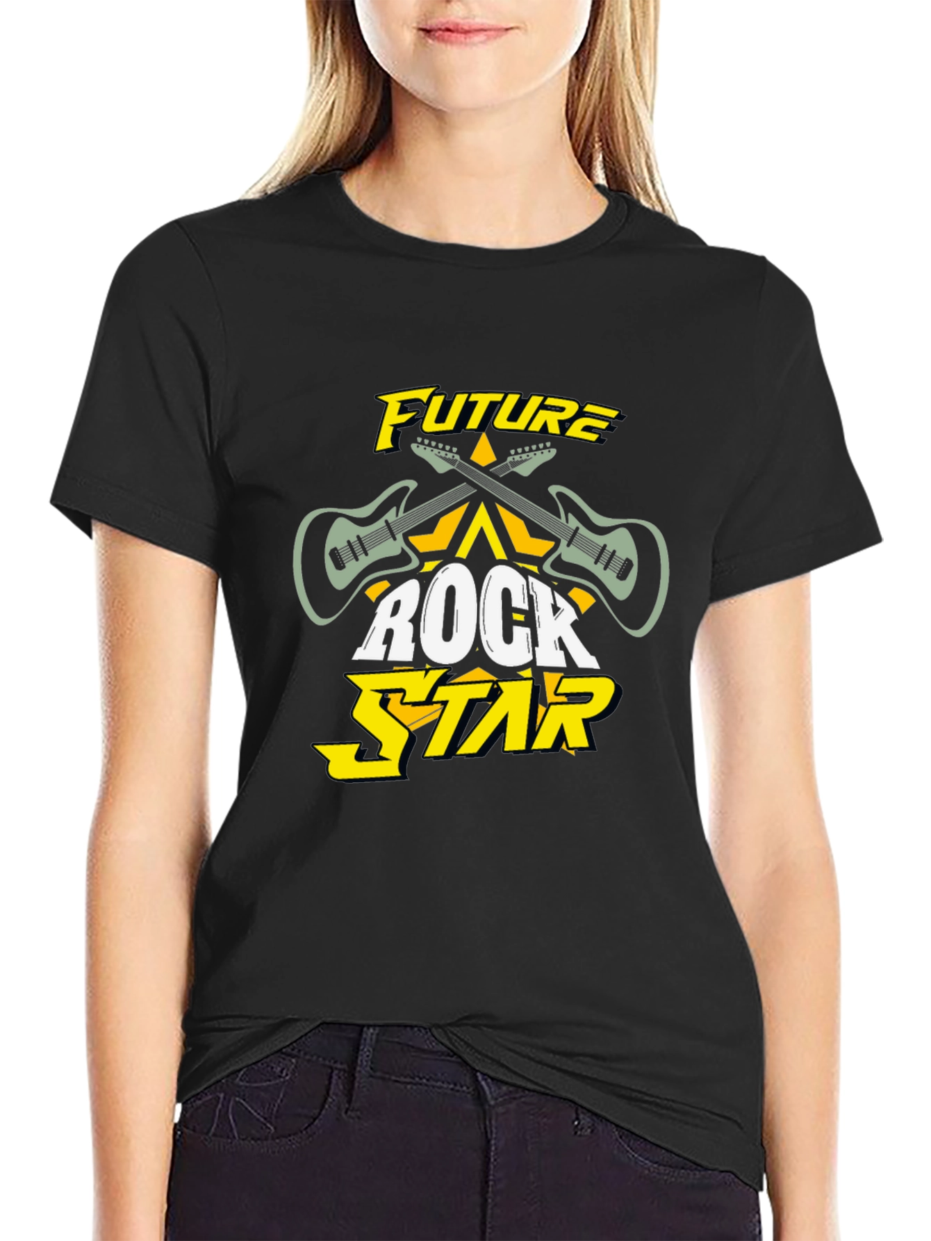 Showcase your rock and roll dreams with this stylish black graphic tee! This t-shirt features a bold "Future Rock Star" design with crossed guitars, perfect for aspiring musicians and rock enthusiasts. The vibrant yellow accents and white text pop against the black background, creating a striking visual impact. Made from a comfortable fabric, this tee is ideal for everyday wear, concerts, band practice, or simply expressing your love for rock music. Embrace your inner rock star and make a statement with this eye-catching t-shirt. Available in various sizes.