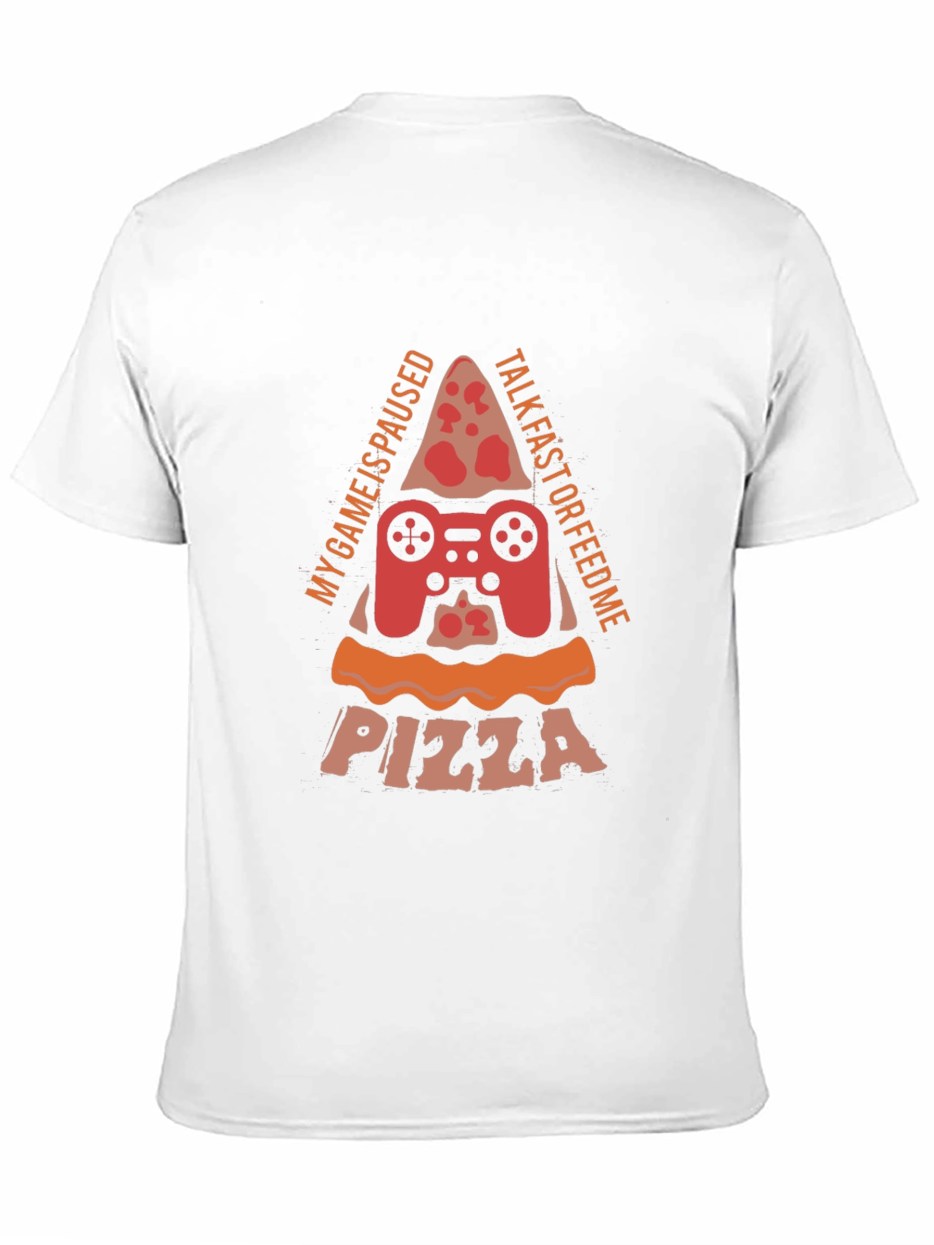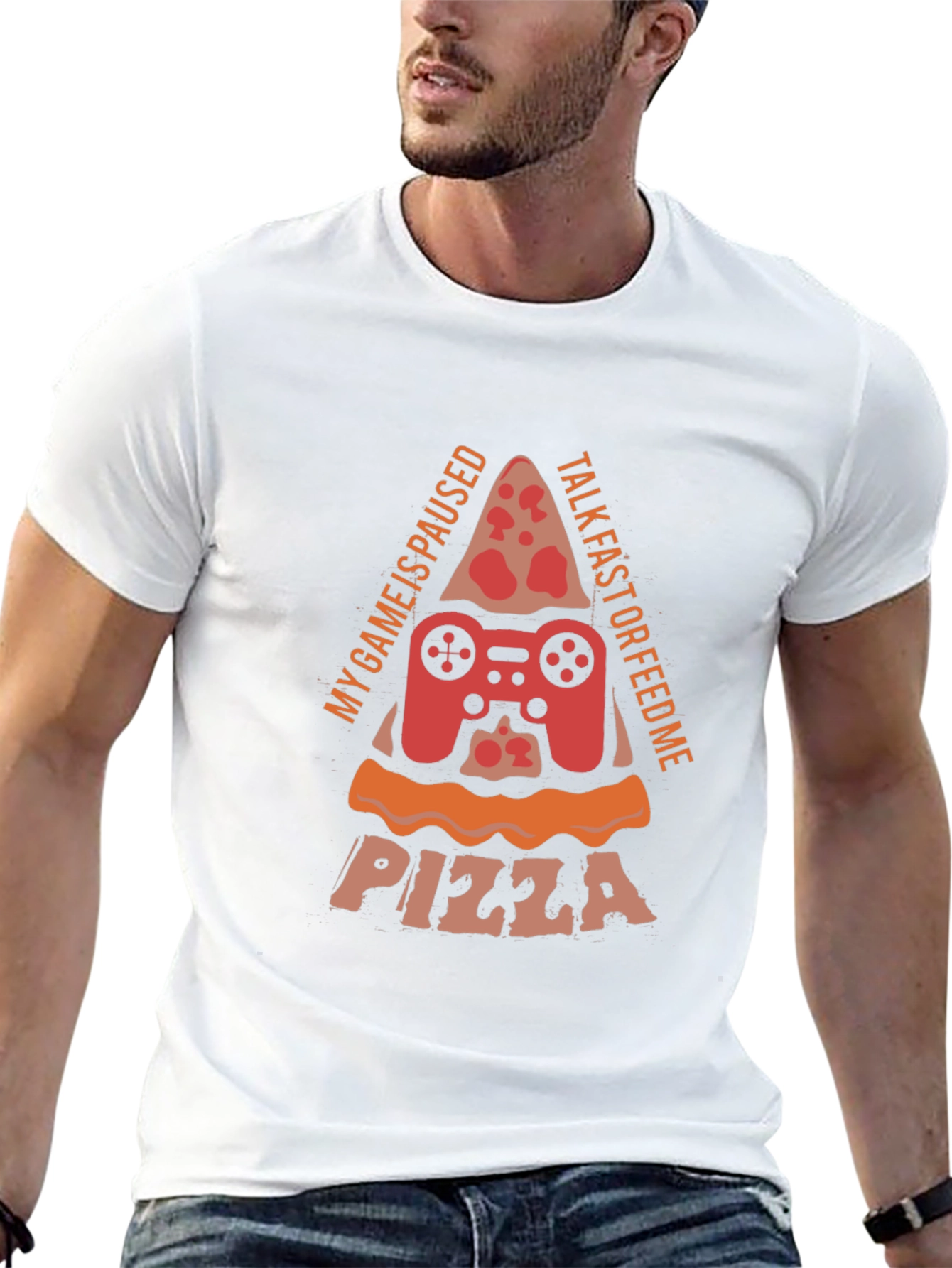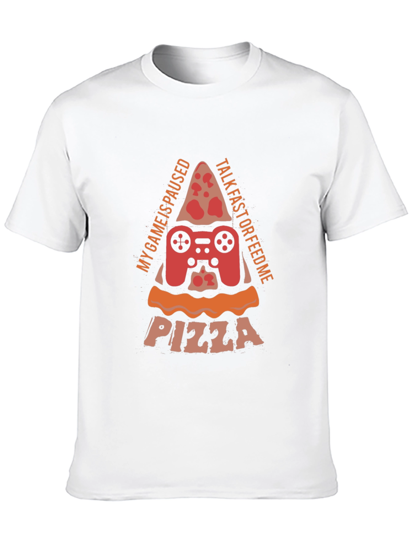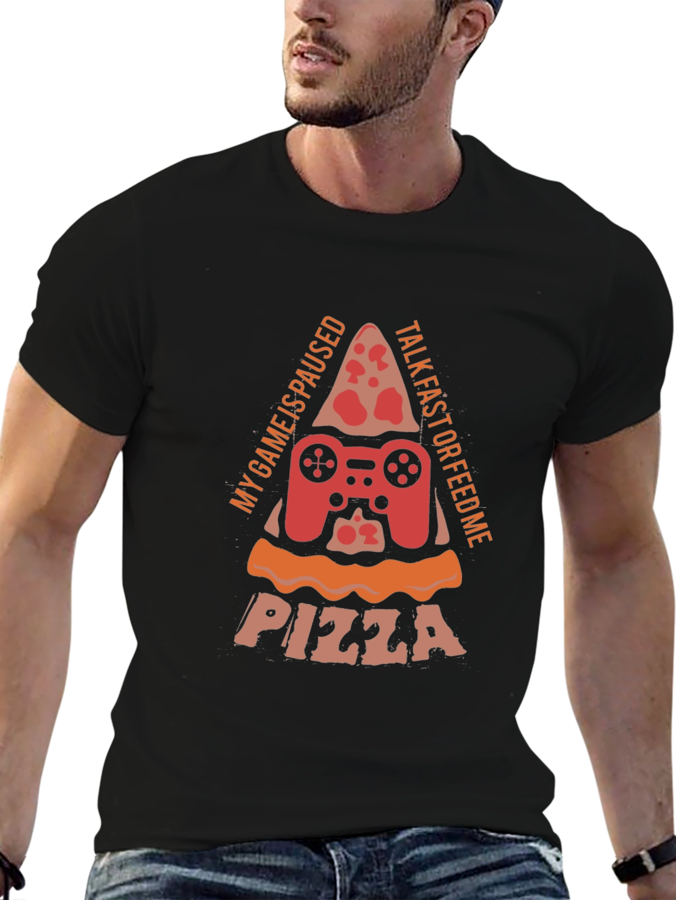 Show off your love for gaming and pizza with this unique t-shirt! The design features a slice of pizza with a game controller image on top. The text "My Game Is Paused. Talk Fast Or Feed Me. Pizza" wraps around the slice. This tee is perfect for casual wear, gaming nights, pizza parties, or as a fun gift for the gamer in your life. Made of a comfortable fabric, this t-shirt combines style and comfort for ultimate wearability. It's a must-have for anyone who appreciates a good laugh and a slice of pizza. Get yours today!