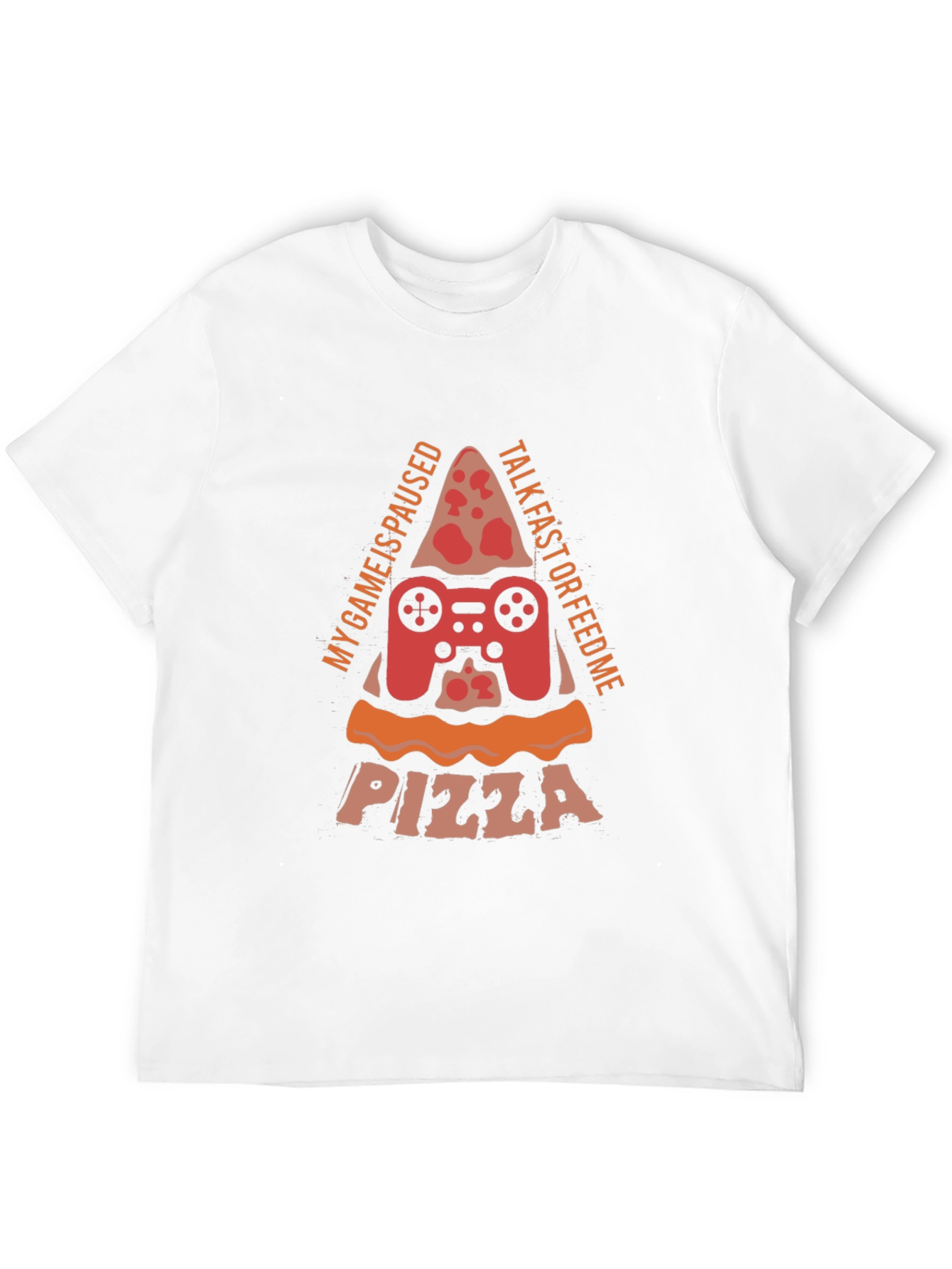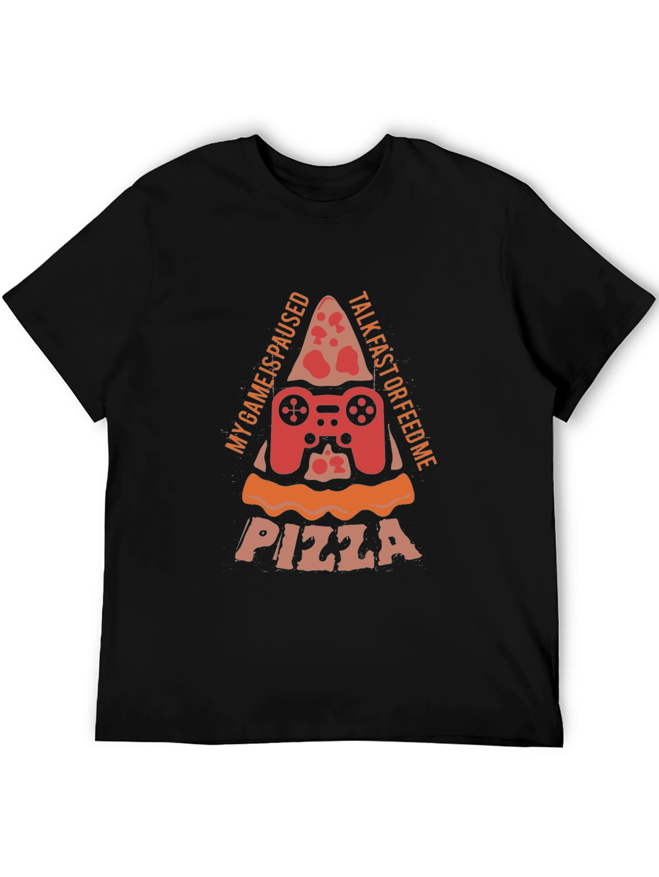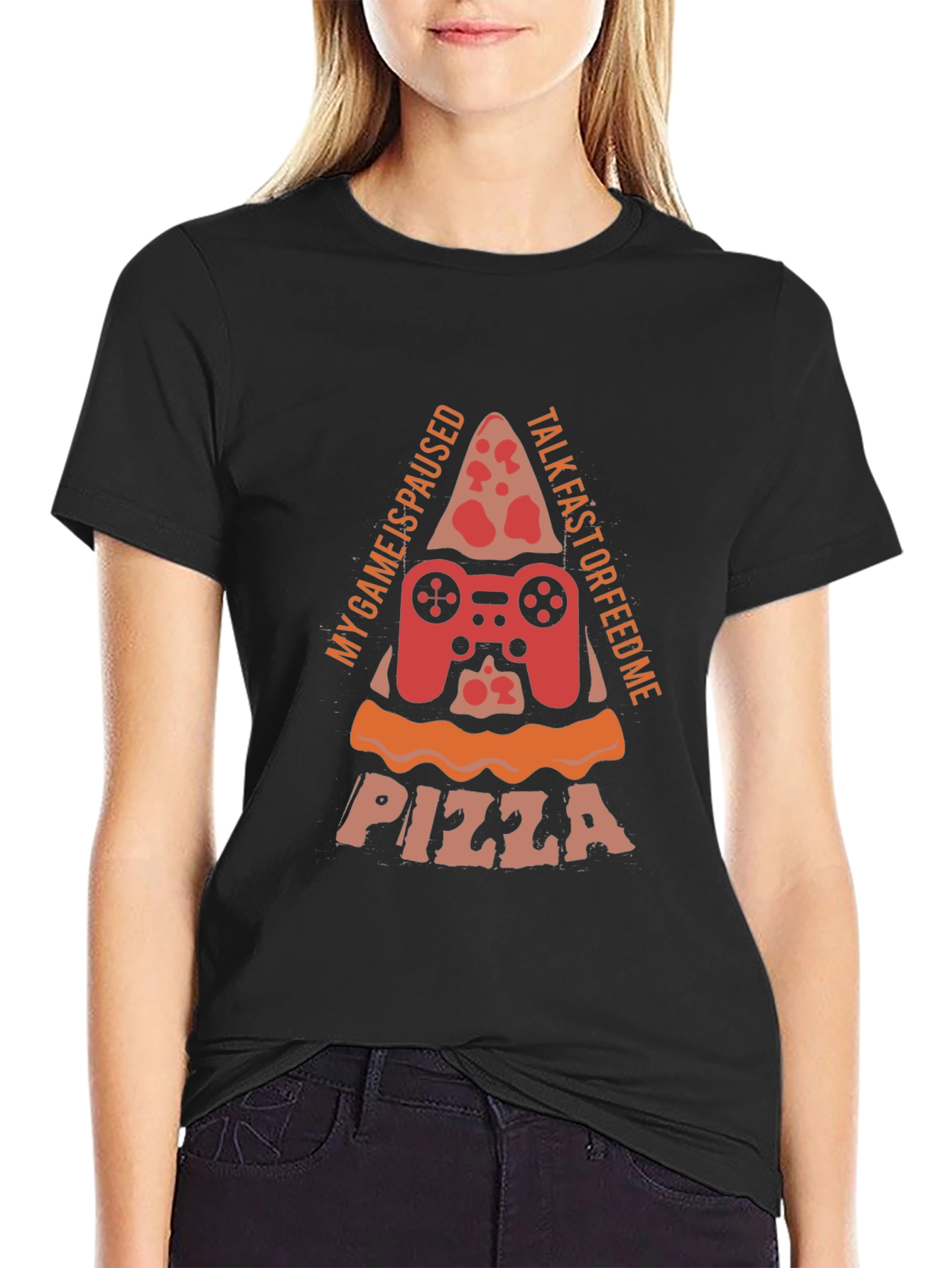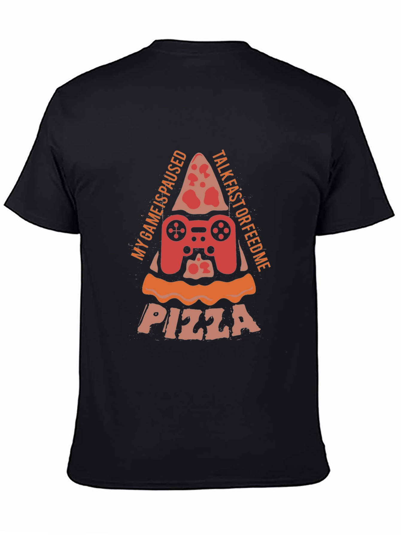 Show off your love for gaming and pizza with this unique t-shirt! The design features a slice of pizza with a game controller image on top. The text "My Game Is Paused. Talk Fast Or Feed Me. Pizza" wraps around the slice. This tee is perfect for casual wear, gaming nights, pizza parties, or as a fun gift for the gamer in your life. Made of a comfortable fabric, this t-shirt combines style and comfort for ultimate wearability. It's a must-have for anyone who appreciates a good laugh and a slice of pizza. Get yours today!
