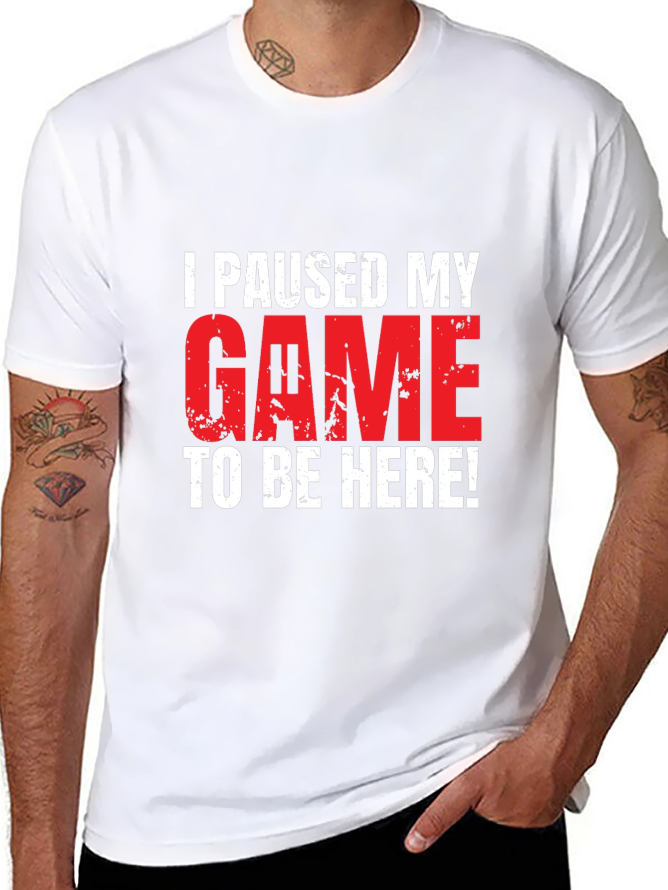 Show off your gamer pride with this bold black t-shirt! This short-sleeved tee features the witty saying "I PAUSED MY GAME TO BE HERE!" in white and red lettering. Made from what appears to be comfortable cotton, this shirt is perfect for casual wear, gaming events, or just lounging at home. Its classic fit ensures a relaxed and stylish look for any gamer. Grab yours and let everyone know where your priorities truly lie (temporarily!).