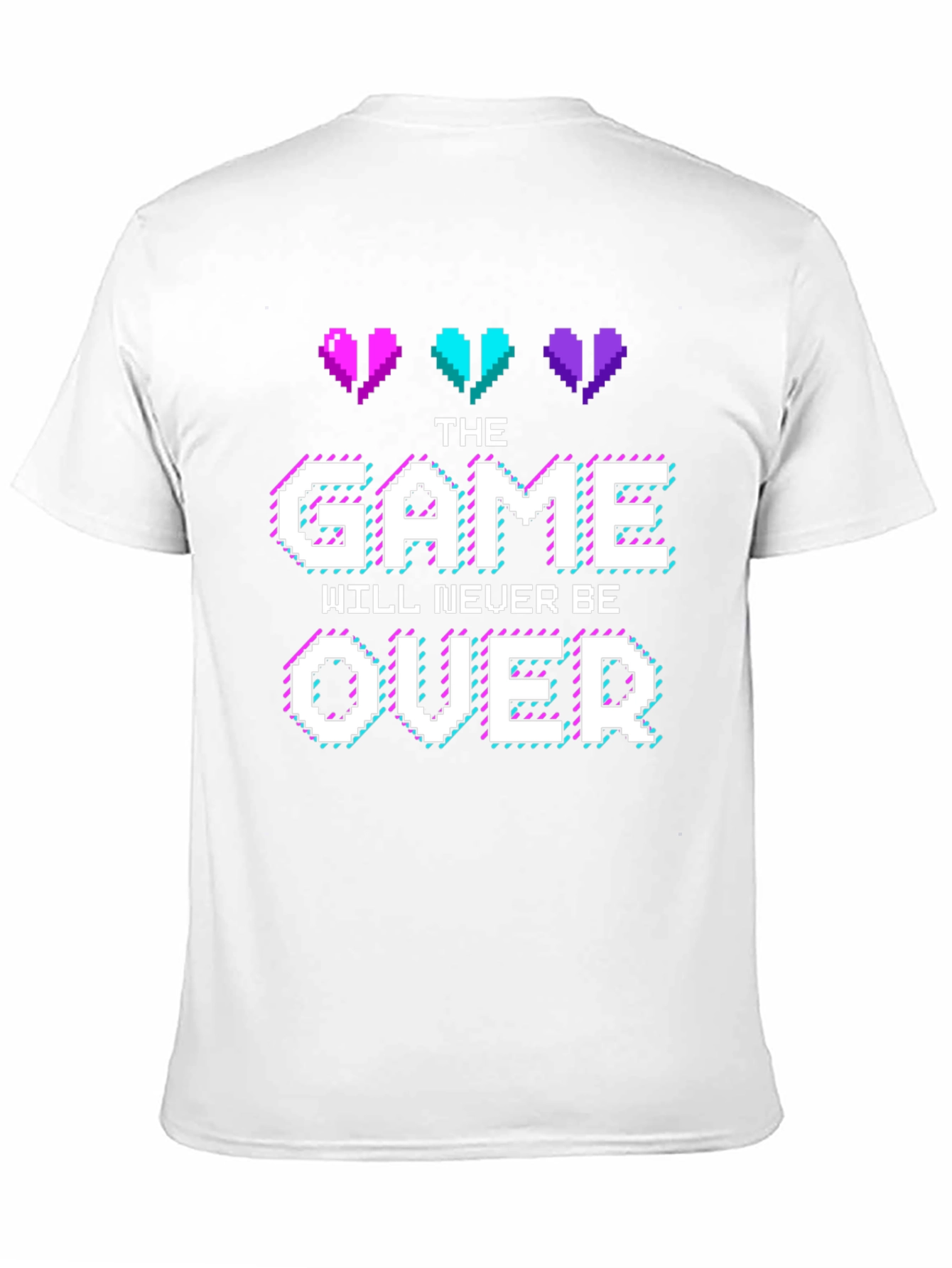 Show off your passion for gaming with this unique graphic t-shirt. The shirt features pixelated hearts in vibrant colors above the text "The Game Will Never Be Over", creating a retro gaming vibe. Made from a comfortable, breathable fabric (material details are not visible), this tee is perfect for casual wear, gaming events, or lounging at home while you level up. The design is eye-catching and makes a statement about your dedication to gaming. It's a great conversation starter and an awesome addition to any gamer's wardrobe. Get yours today and let everyone know the game never ends!