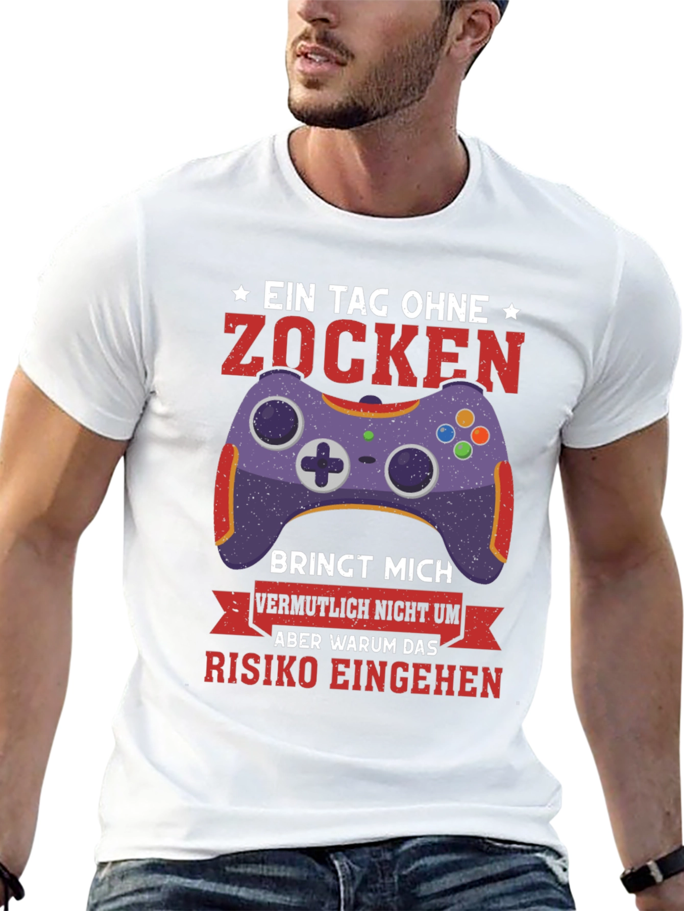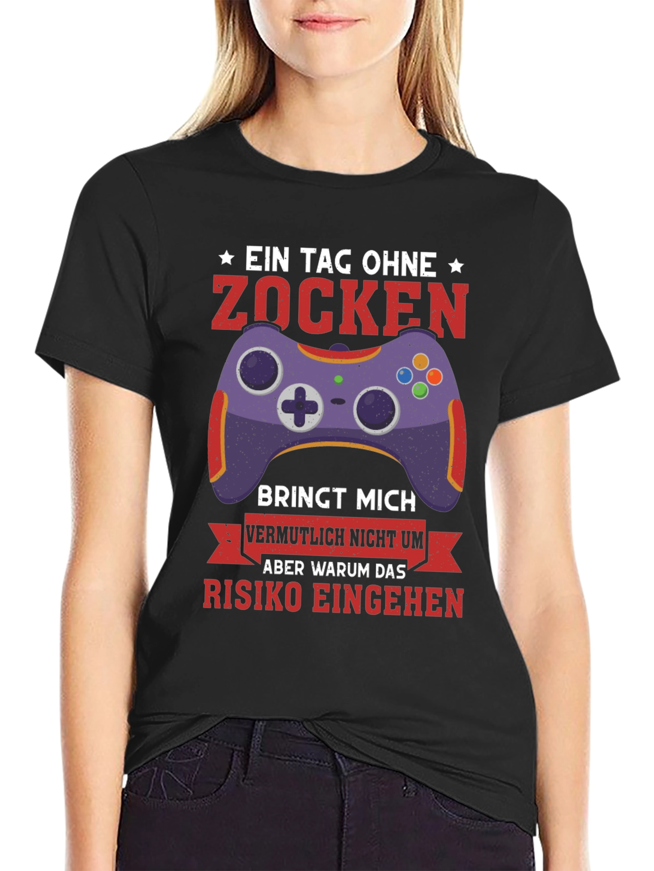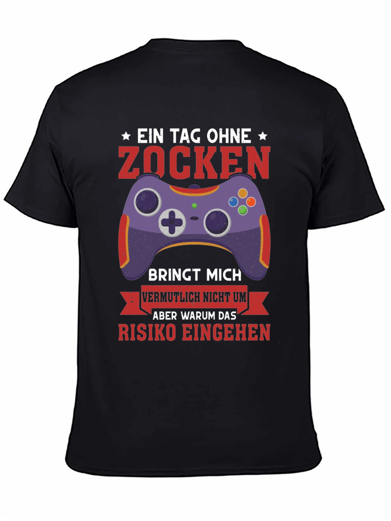 Show off your love for gaming with this unique black t-shirt. The design features a vibrant purple gaming controller and bold red text in German. The humorous slogan translates to "A day without gaming probably won't kill me, but why take the risk?" This tee is perfect for gamers, tech enthusiasts, or anyone who appreciates witty apparel. Made from comfortable fabric, this shirt is ideal for everyday wear, gaming sessions, or casual outings. Makes a great gift for the gamer in your life. Add this eye-catching t-shirt to your wardrobe and let everyone know where your priorities lie!