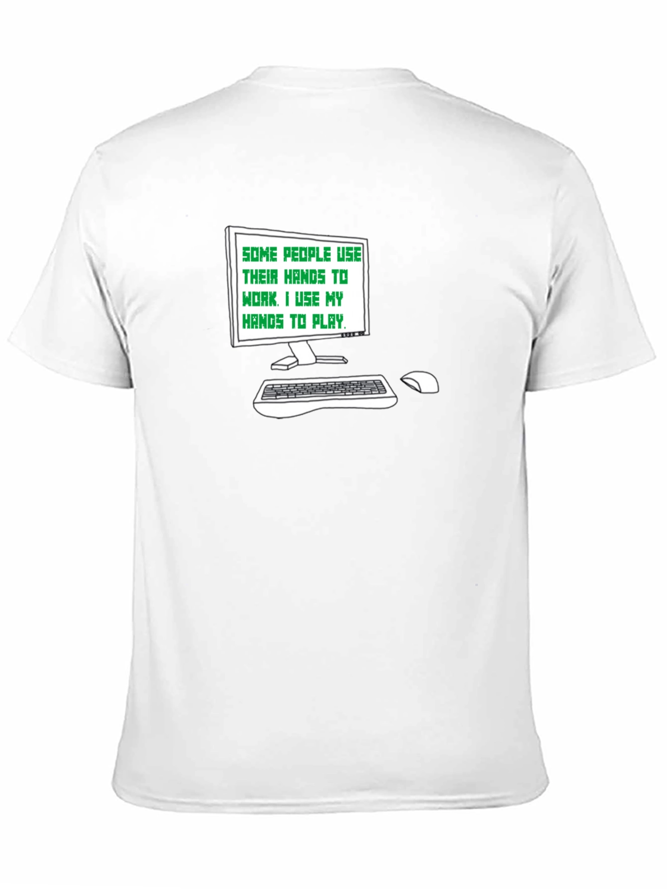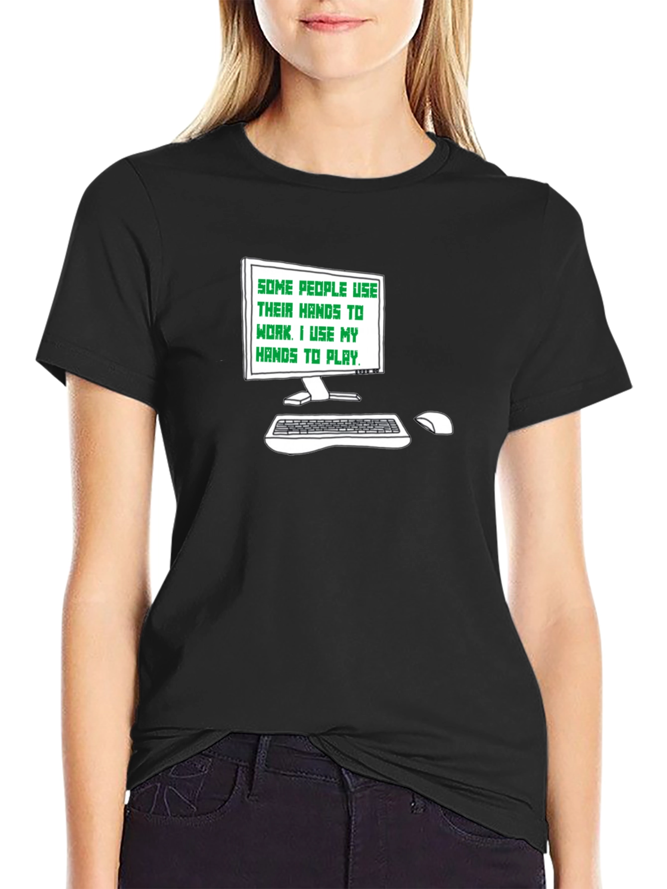 Show off your gaming pride with this eye-catching black t-shirt. Featuring a humorous design of a vintage-style computer screen displaying the phrase, "Some people use their hands to work. I use my hands to play," this tee is perfect for gamers and tech enthusiasts alike. The white keyboard and mouse add to the retro computer aesthetic. Made from a comfortable-looking fabric, it's ideal for casual wear while gaming, hanging out with friends, or attending gaming events. A fun and unique statement piece for anyone who loves to play!