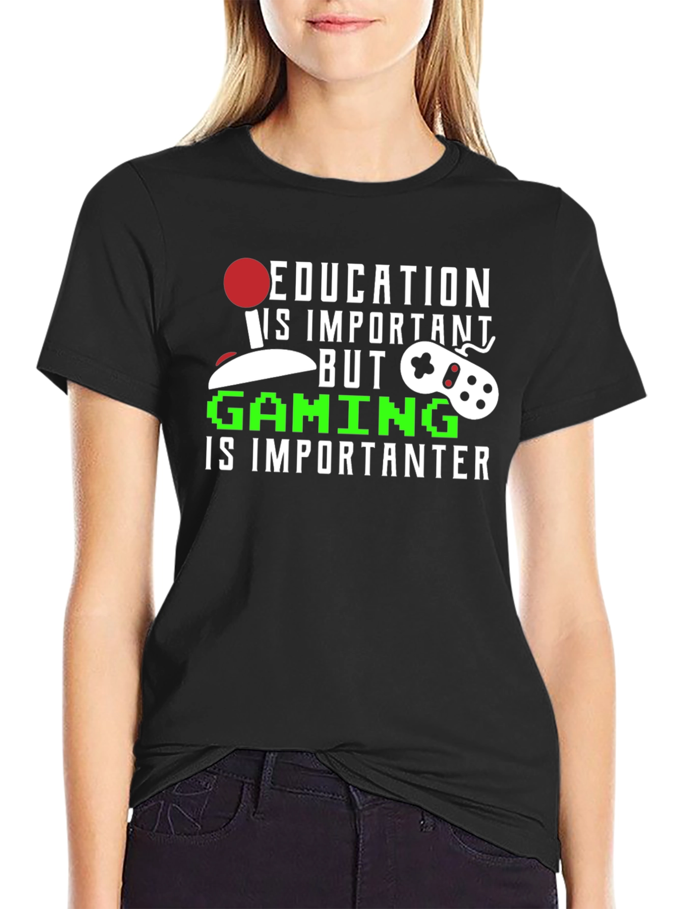 Show off your love for gaming with this fun black t-shirt! The shirt features a playful design with the text "Education is Important BUT Gaming is Importanter" alongside a retro video game controller graphic. The bold design is sure to turn heads and spark conversations. Made from a comfortable-looking fabric, this tee is perfect for casual wear, gaming sessions with friends, or everyday wear. A great gift for gamers of all ages, this t-shirt is a must-have addition to any gamer's wardrobe.