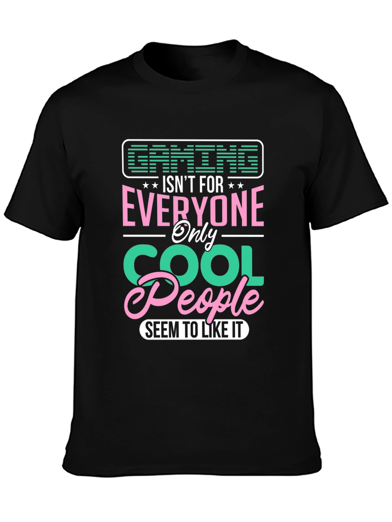 This stylish black t-shirt features a bold and humorous graphic design perfect for gamers. The design reads "Gaming Isn't For Everyone - Only Cool People Seem To Like It," presented in eye-catching mint, pink, and white typography. The shirt is made from what appears to be a soft and comfortable cotton blend, ideal for everyday wear. Its classic fit makes it a versatile addition to any casual wardrobe. Whether you're attending a gaming convention, hanging out with friends, or just relaxing at home, this t-shirt is sure to express your unique sense of humor and love for gaming. Make a statement and showcase your cool factor with this fun and relatable tee!