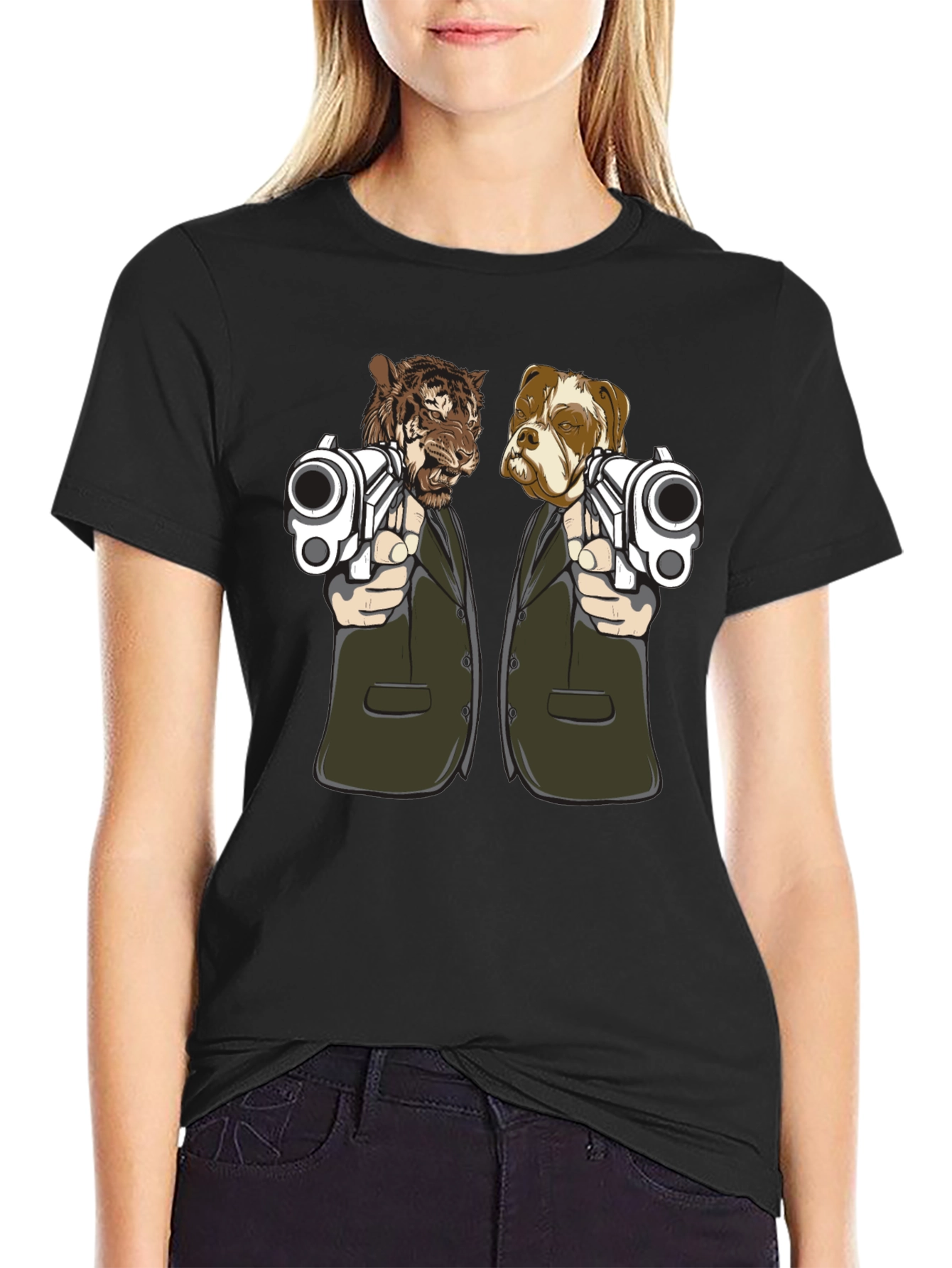 Show off your unique style with this eye-catching graphic tee. Featuring a bold design of a tiger and a dog in suits holding guns, this shirt is sure to turn heads. Made from comfortable, breathable fabric, this tee is perfect for everyday wear. The vibrant print showcases high-quality detailing and vivid colors. Ideal for casual outings, concerts, or expressing your individuality, this tee makes a statement. Pair it with jeans or shorts for a cool, edgy look. This unique design is a must-have for animal lovers and anyone who appreciates bold fashion.