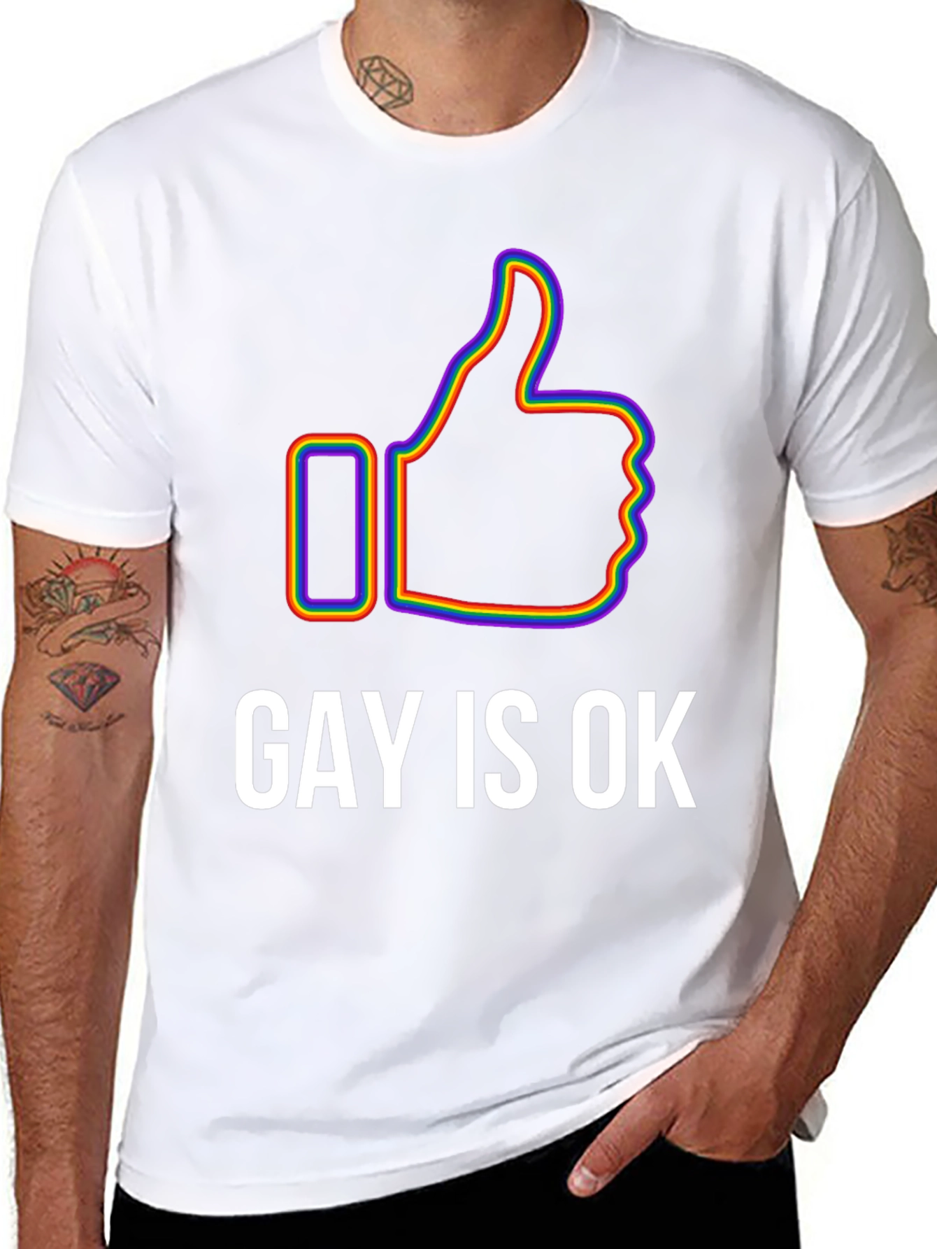 Show your support with this bold 'Gay Is Ok' t-shirt. The shirt features a thumbs-up symbol outlined in vibrant rainbow colors, promoting love and acceptance. Made from a comfortable black fabric, this tee is perfect for everyday wear, pride events, or casual outings. The simple yet powerful design makes it a great conversation starter. Spread a message of equality and inclusivity with this stylish and meaningful t-shirt.