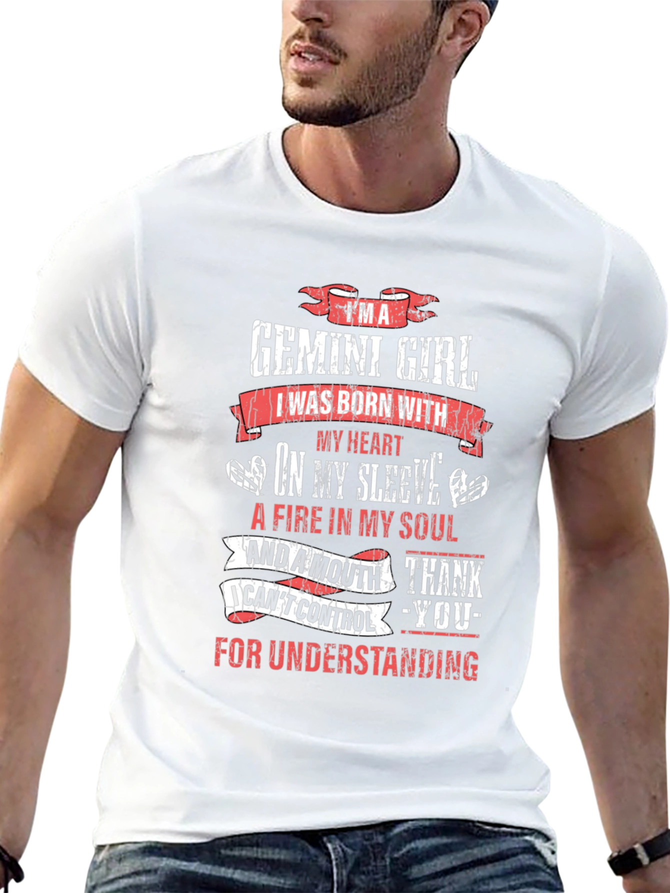 Show off your zodiac pride with this unique Gemini Girl t-shirt! The black tee features a bold, distressed red and white graphic proclaiming "I'm a Gemini Girl. I was born with my heart on my sleeve, a fire in my soul and a mouth I can't control - thank you for understanding." This statement piece is perfect for the outspoken and passionate Gemini. Made from a comfortable-looking fabric, this tee is ideal for everyday wear. Whether you're running errands, hanging out with friends, or just lounging at home, let everyone know you're a Gemini who isn't afraid to be themselves. A great gift for any Gemini woman with a sense of humor and a fiery spirit! The design conveys a message that will surely resonate with fellow Geminis and those who appreciate authentic personalities.