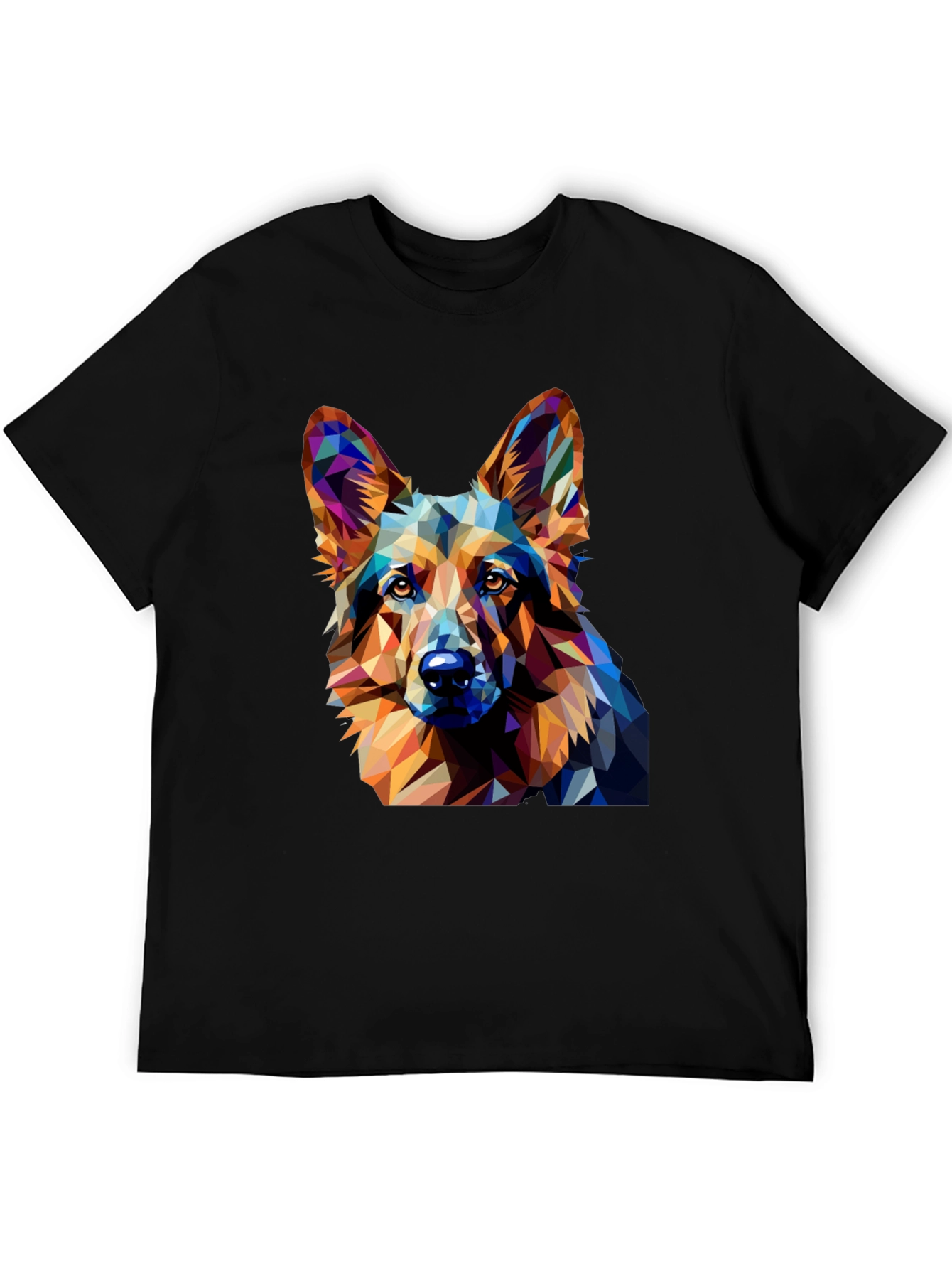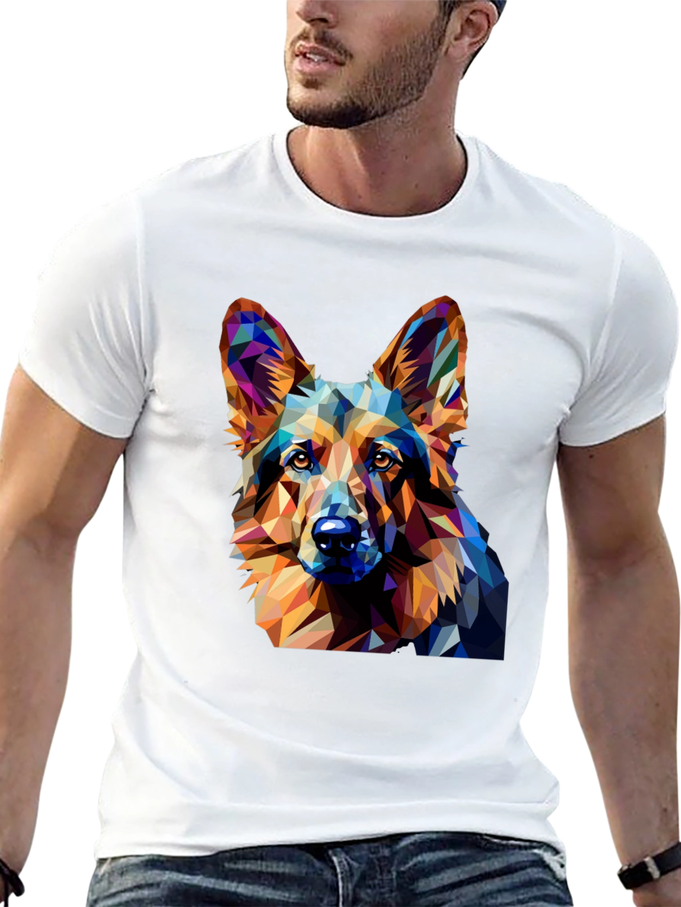 Show off your love for dogs with this unique and stylish t-shirt. Featuring a striking geometric design of a German Shepherd, this tee is sure to turn heads. The vibrant colors and modern artistic style make it a standout piece. Made from comfortable, breathable fabric, it's perfect for everyday wear. Whether you're running errands, hanging out with friends, or just relaxing at home, this shirt is a great way to express your personality and passion for canines. Add a touch of contemporary art to your wardrobe with this eye-catching dog-themed t-shirt.