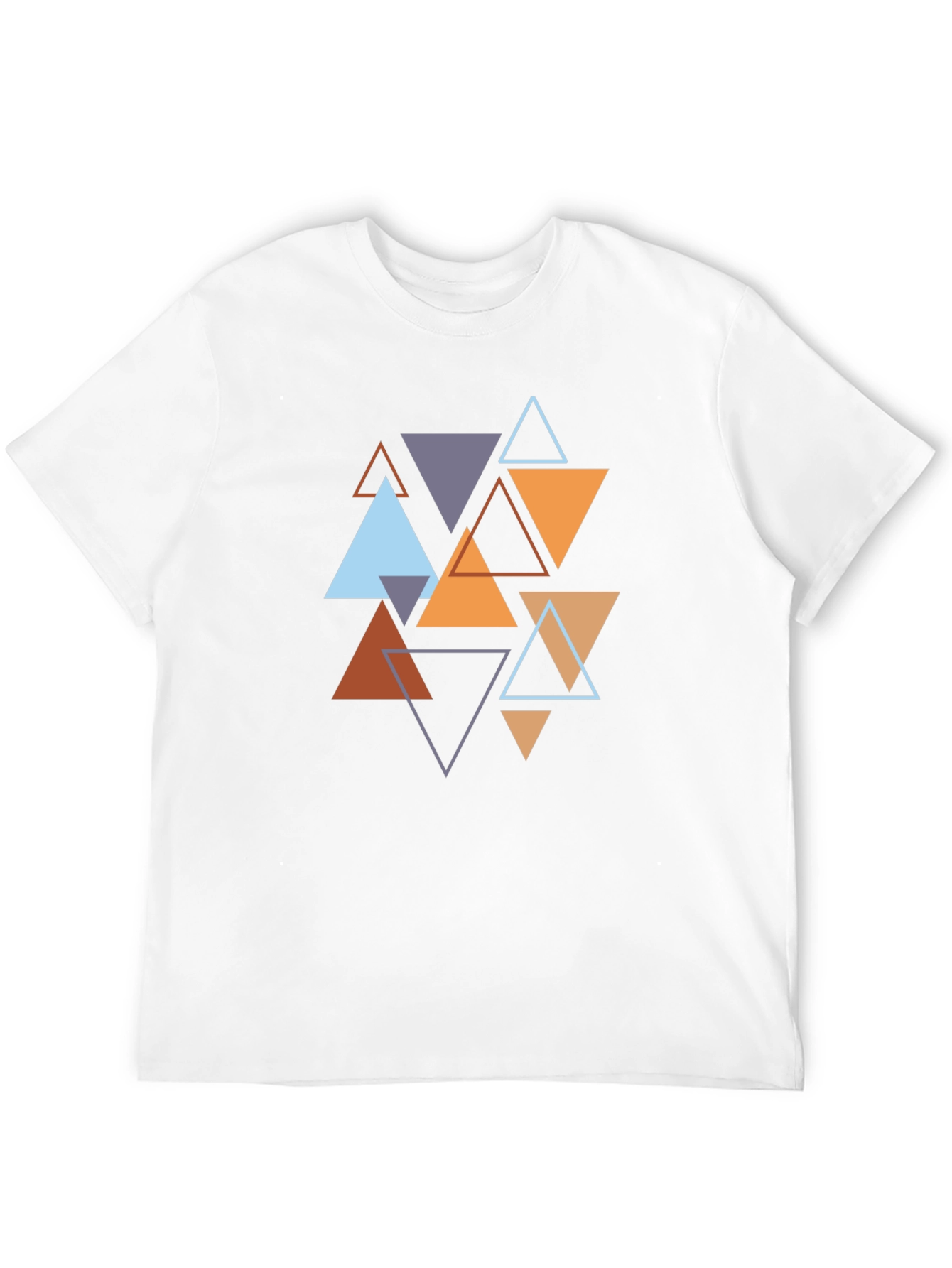 Showcase your unique style with this eye-catching men's t-shirt. Featuring a bold, geometric triangle design in an array of colors, this shirt is a statement piece. The design incorporates shades of orange, blue, and gray. Made from what appears to be a comfortable, breathable fabric, this shirt is ideal for everyday wear. Whether you're heading out with friends or just relaxing at home, this tee offers both style and comfort. The classic crew neck and short sleeve design make it a versatile addition to any wardrobe. Get ready to turn heads with this modern graphic tee.