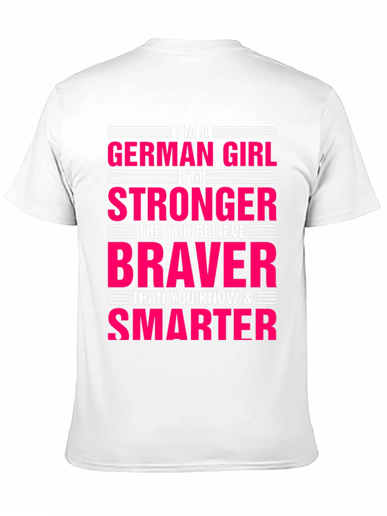 This black t-shirt features a bold statement for proud German girls. In vibrant pink text, it declares "I'M A GERMAN GIRL" followed by "I'M STRONGER THE YOU BELIEVE BRAVER THAN YOU KNOW & SMARTER." The design incorporates white horizontal lines above and below each phrase, adding a touch of visual interest and emphasis. Made from a comfortable-looking fabric, this tee is perfect for casual wear. Show off your German pride and showcase your strength, bravery, and smarts with this unique t-shirt. A perfect gift for a German girl who knows her worth.