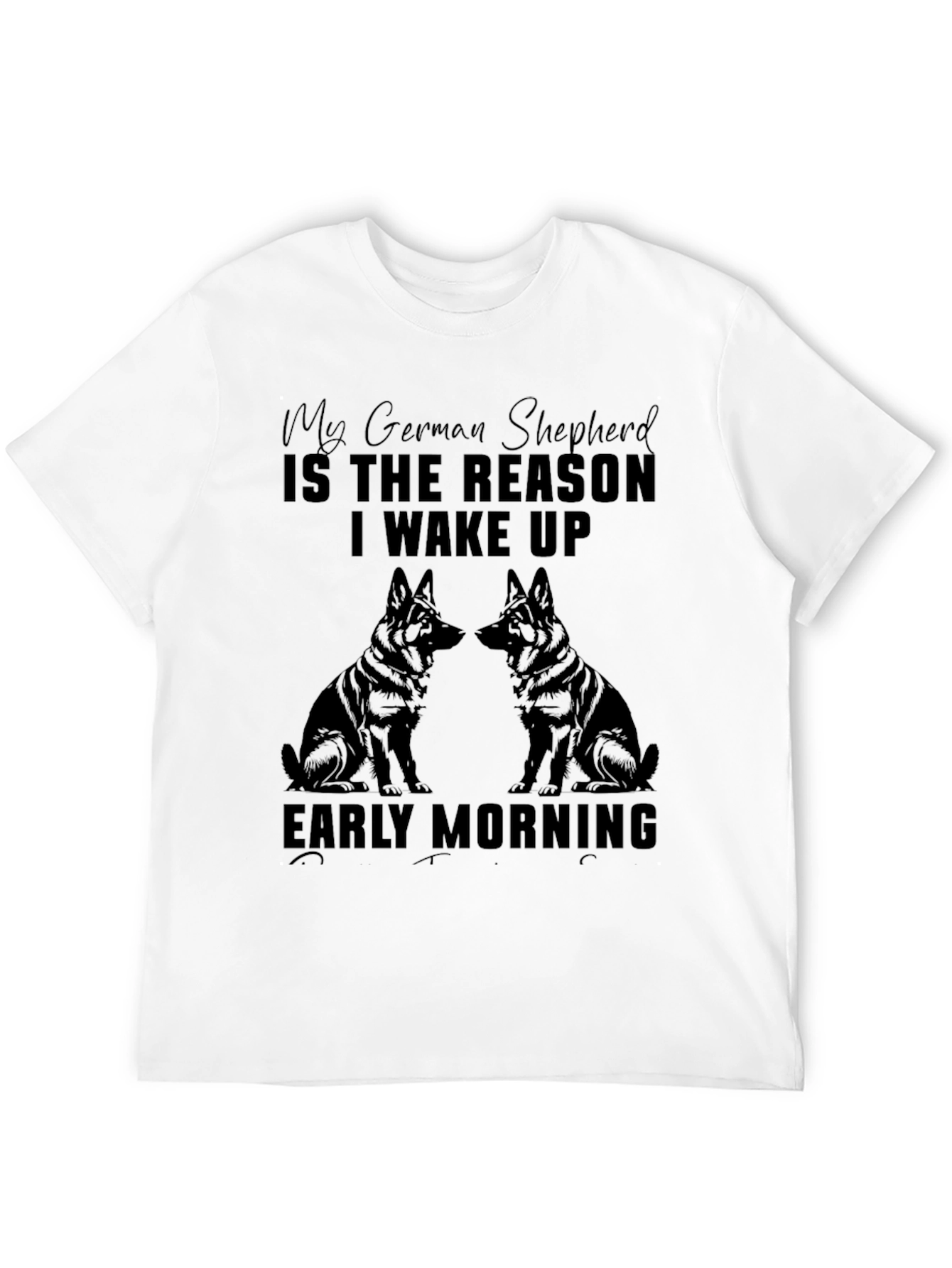Showcase your love for your German Shepherd with this unique black t-shirt. The shirt features a bold graphic print that says "My German Shepherd IS THE REASON I WAKE UP EARLY MORNING" along with a mirrored image of two German Shepherds. Made from a comfortable material, this t-shirt is perfect for casual wear, dog walks, or simply lounging around at home. It's a great conversation starter and a must-have for any German Shepherd owner or enthusiast. Let everyone know how much you adore your furry friend with this stylish and expressive t-shirt.