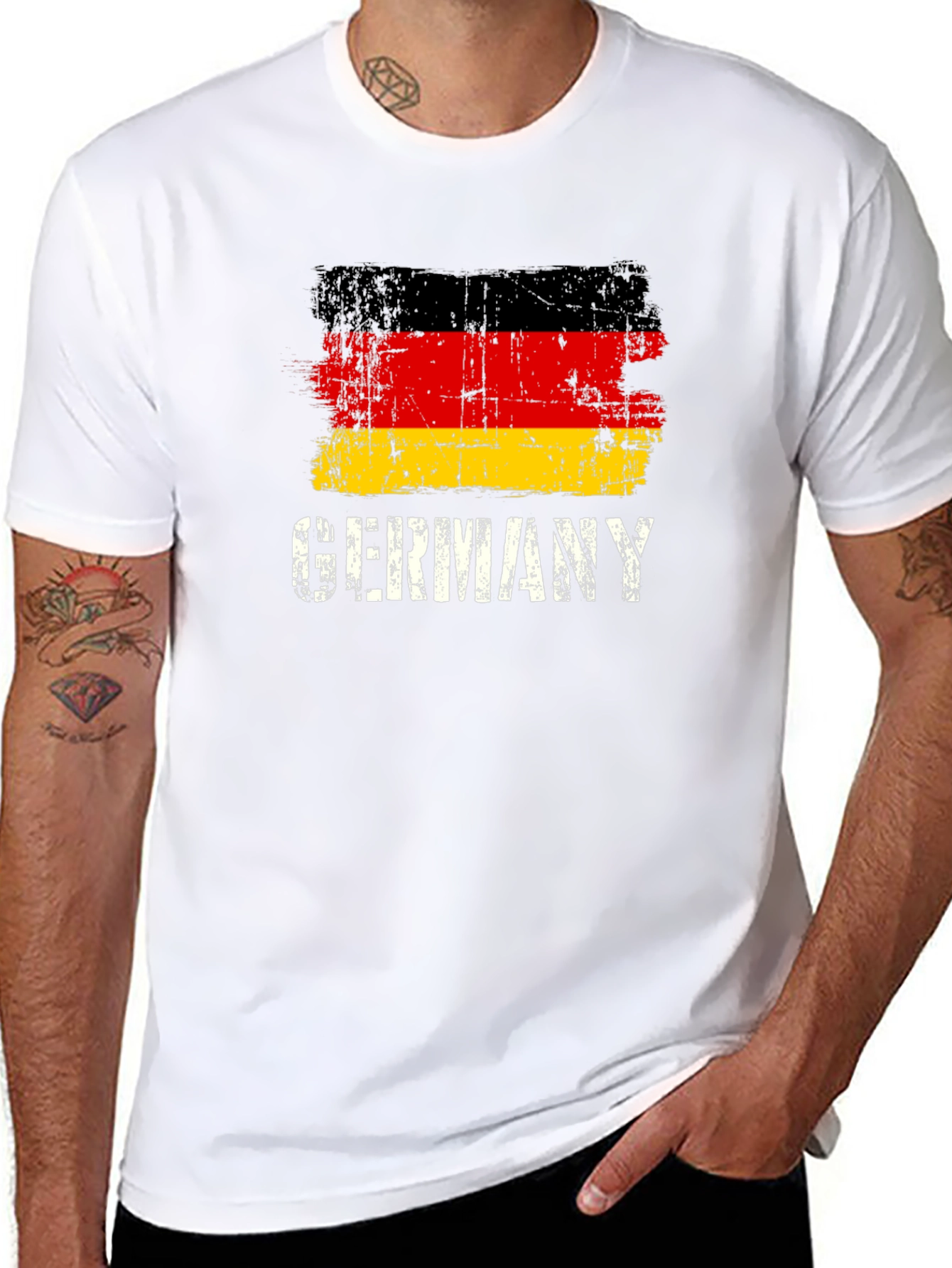Show your German pride with this striking black t-shirt. The shirt features a distressed-style print of the German flag in bold black, red, and yellow. Below the flag is the word 'GERMANY' in a matching distressed font, adding to the vintage aesthetic. The shirt is made from what appears to be a soft, comfortable cotton blend, ideal for casual wear. Perfect for sporting events, national holidays, or simply expressing your love for Germany. This tee is sure to make a statement and become a favorite in your wardrobe.