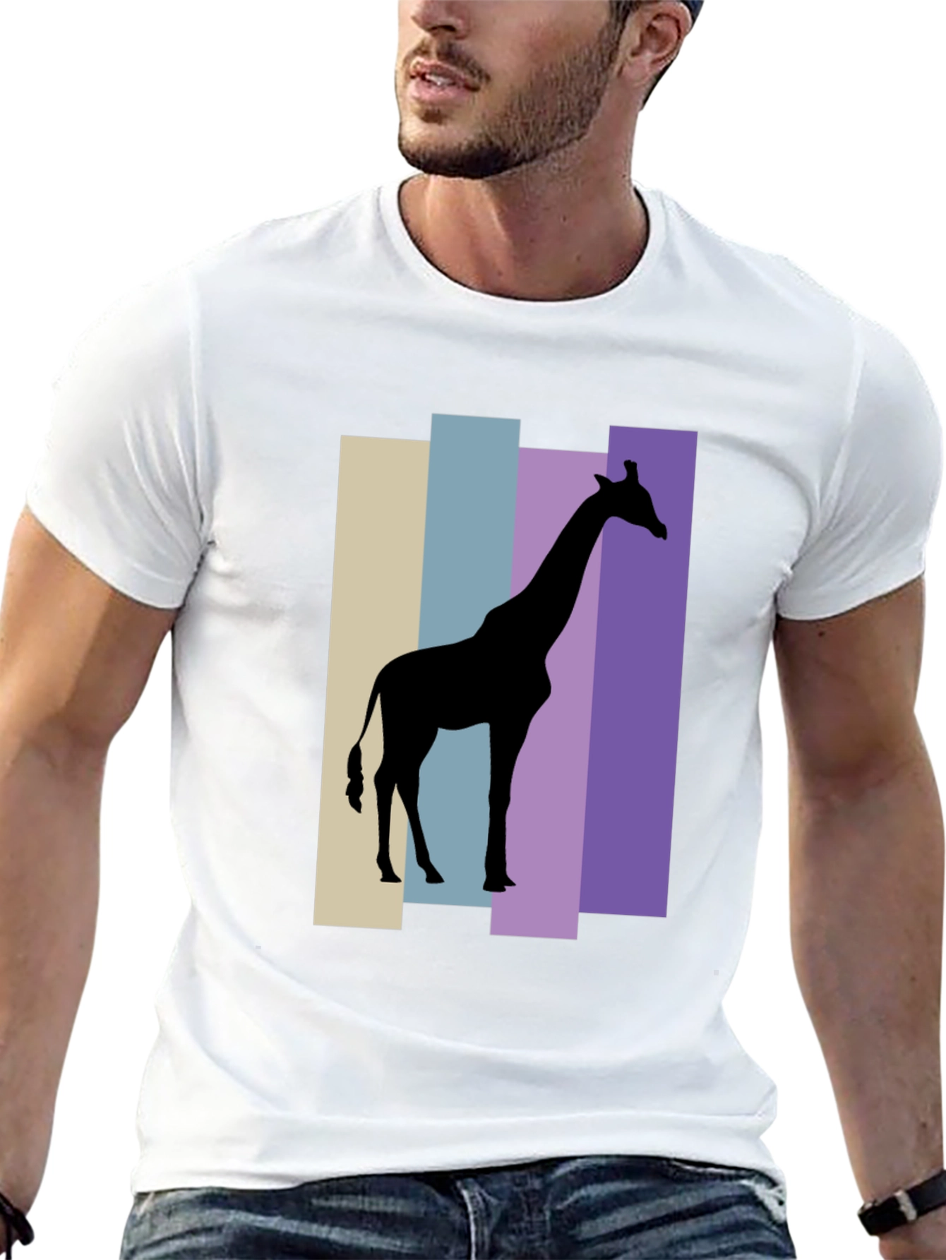 This striking black t-shirt features a bold giraffe silhouette set against a retro-inspired backdrop of pastel stripes. The unique design makes a statement, perfect for adding a touch of whimsy to your wardrobe. Crafted from a soft, comfortable fabric, this tee offers a relaxed fit for everyday wear. Ideal for casual outings, animal lovers, or anyone seeking a standout graphic tee. Show off your unique style with this eye-catching giraffe tee! Pairs perfectly with jeans, shorts, or skirts for a versatile look.