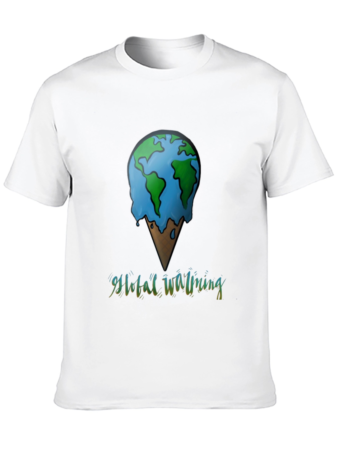 This unique t-shirt features a thought-provoking design of planet Earth depicted as a melting ice cream cone. Printed on a classic black tee, the graphic illustrates the concept of global warming in a creative and eye-catching way. The Earth's continents are rendered in green, covered with a melting blue ice cream texture, all sitting atop a cone. Below the image, the words "Global Warming" are stylishly written in a colorful, handwritten-style font. This shirt is perfect for anyone passionate about environmental issues and looking to make a statement through fashion. The comfortable fit and bold design will make it a standout piece in any casual wardrobe.