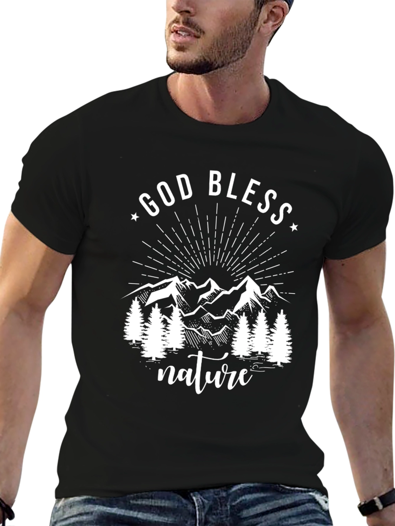 Show your love for nature with this stylish black t-shirt. Featuring a unique white graphic of mountains and trees with the words "God Bless Nature," this tee is perfect for outdoor enthusiasts and anyone who appreciates the beauty of the natural world. Made from a soft, comfortable fabric, it's ideal for casual wear, hiking trips, or relaxing by the campfire. The eye-catching design is sure to spark conversations and spread positivity. Get yours today and embrace the great outdoors!
