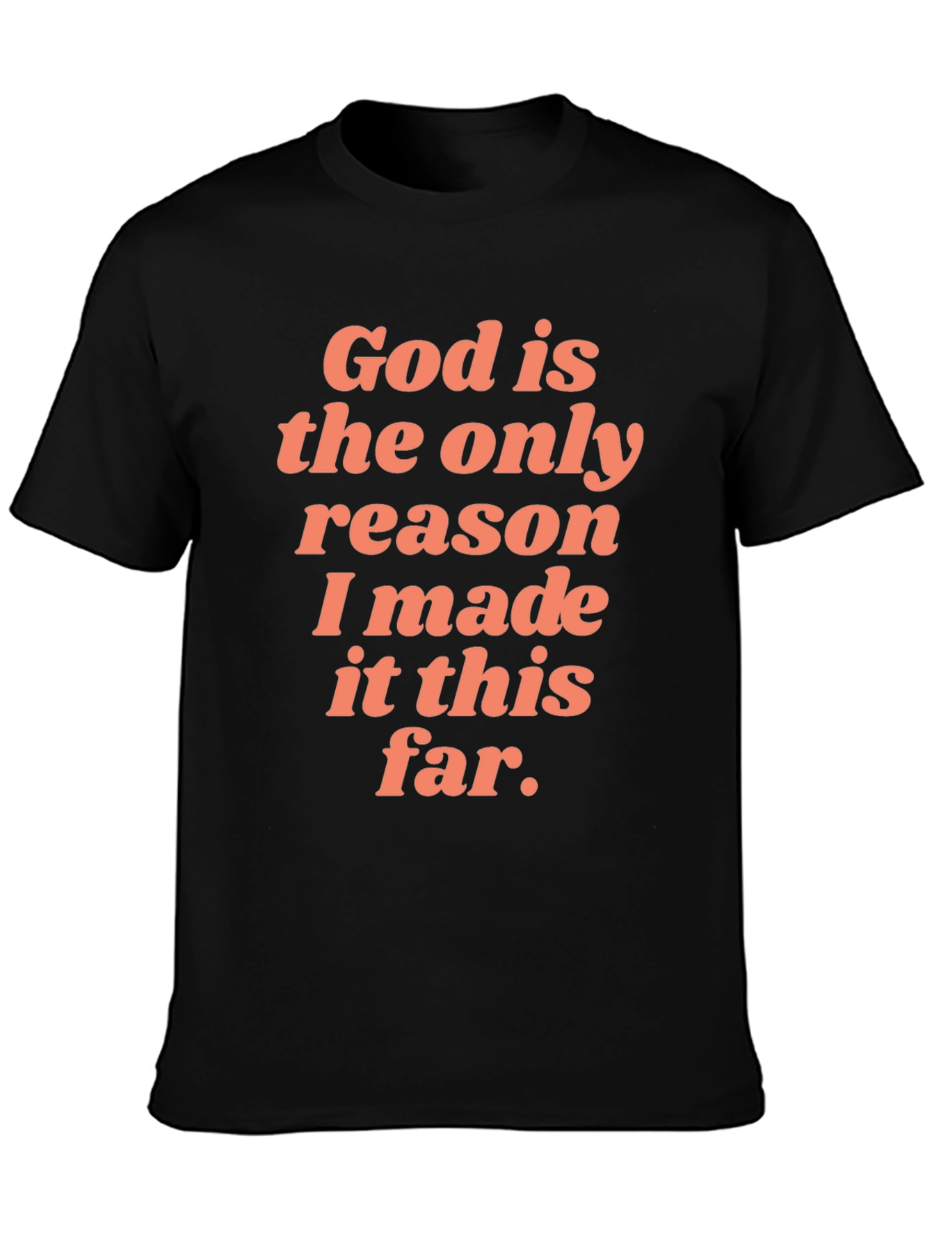This stylish black t-shirt features a bold, eye-catching statement in a coral-pink hue that reads, "God is the only reason I made it this far." Made from what appears to be a soft, comfortable cotton blend, this tee offers a relaxed fit, perfect for everyday wear. The classic crew neck and short sleeves ensure a timeless appeal. Ideal for expressing faith and adding a touch of personality to your wardrobe, this t-shirt can be effortlessly paired with jeans, shorts, or casual pants for a versatile look. Show off your beliefs with this fashionable and meaningful piece!