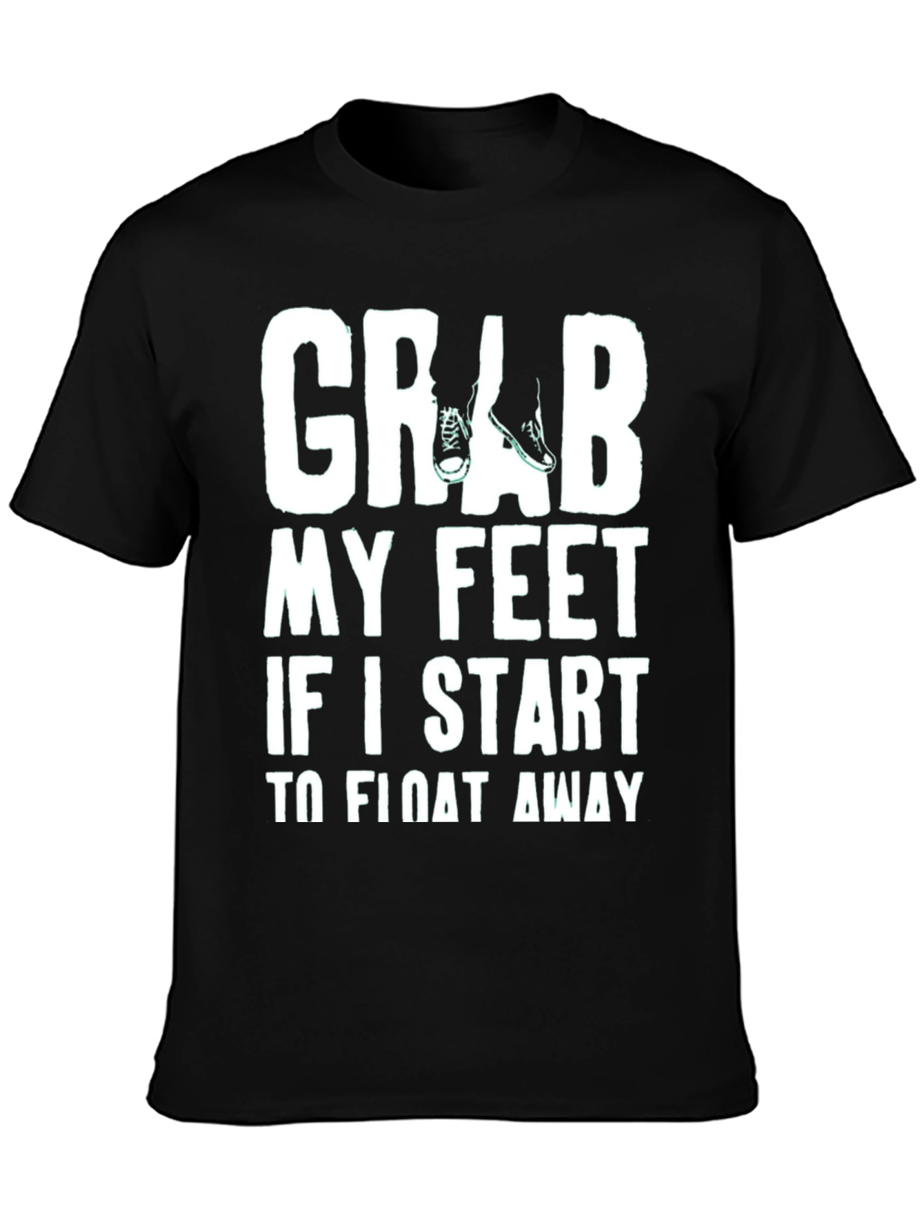 This stylish black t-shirt features a humorous white graphic print. The print reads, "GRAB MY FEET IF I START TO FLOAT AWAY," playfully displayed with an image of two feet with laced shoes in the middle of the word “GRAB”. Made from comfortable material, this tee is perfect for casual wear. Its unique design is sure to spark conversations and bring laughter. Ideal for everyday wear, outings with friends, or as a fun gift for someone with a great sense of humor. Add a touch of whimsy to your wardrobe with this statement piece!
