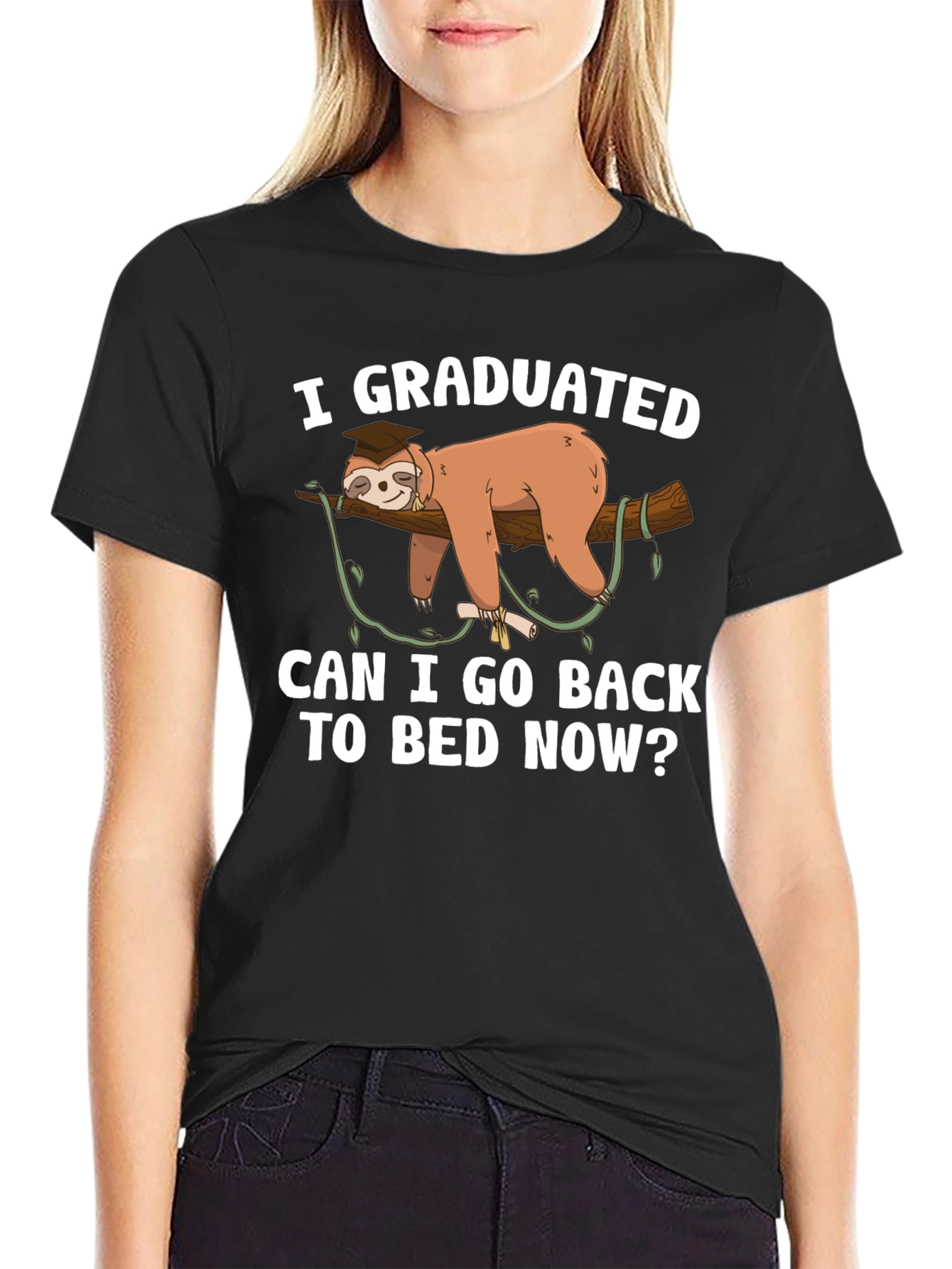 Celebrate graduation with this funny graphic t-shirt. Featuring a sloth wearing a graduation cap and holding a diploma, resting on a branch with vines, this tee expresses post-graduation relaxation. The humorous text "I Graduated Can I Go Back To Bed Now?" adds a touch of whimsy. Made from soft, comfortable fabric, it's perfect for casual wear, graduation parties, or lounging at home after the big day. A great gift for graduates who appreciate a good laugh and a comfortable tee. A must-have for the graduate with a relaxed style.