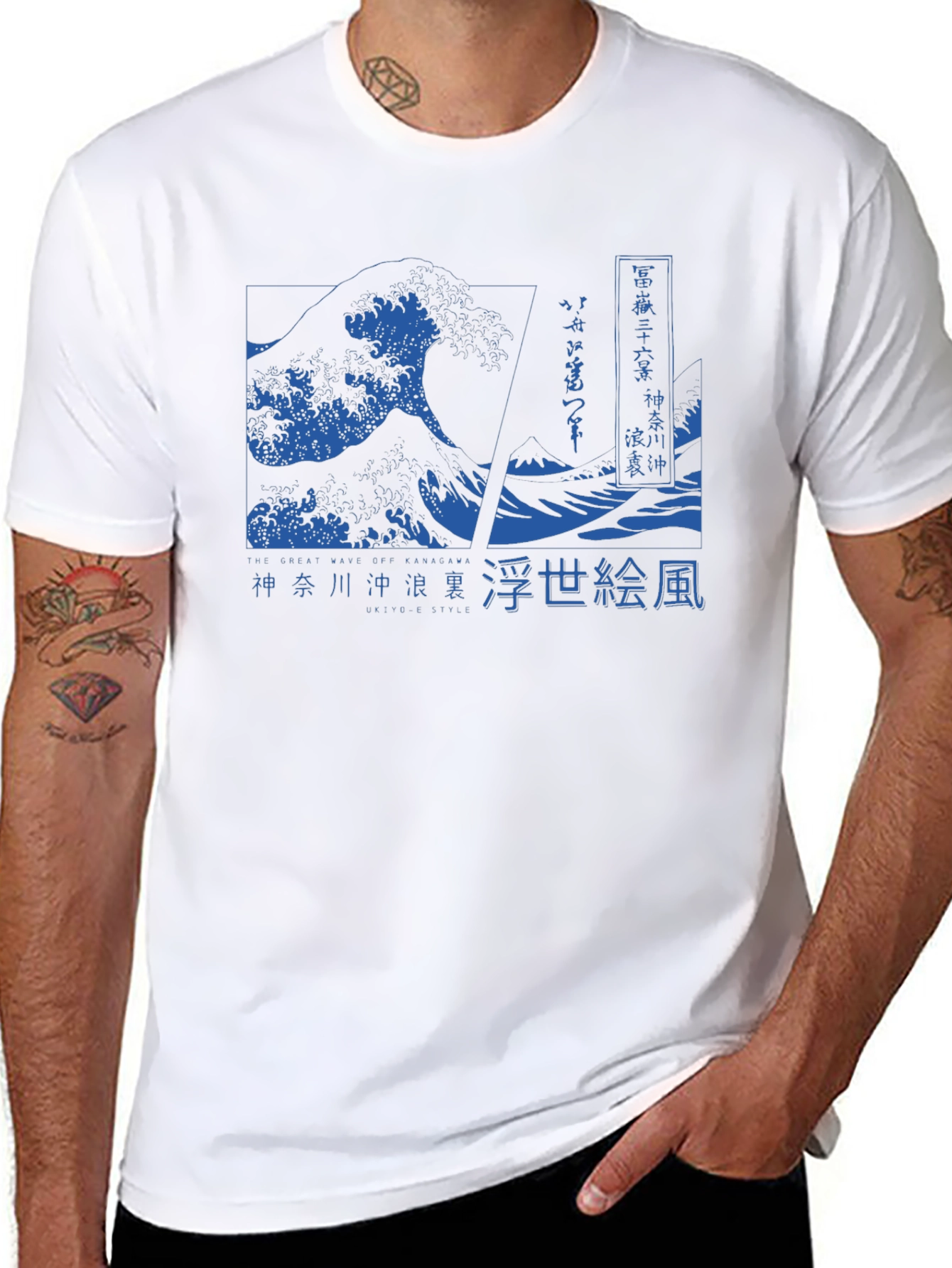 Make a statement with this striking black graphic tee featuring a stylized, artistic rendition of the iconic Great Wave Off Kanagawa. The design showcases a bold, blue graphic print, instantly adding a touch of cool sophistication to your wardrobe. Made from comfortable, breathable fabric, this tee is perfect for casual outings, social gatherings, or simply lounging around at home. Pair it with your favorite jeans or shorts for an effortlessly stylish look. This unique t-shirt is sure to turn heads and spark conversations wherever you go.