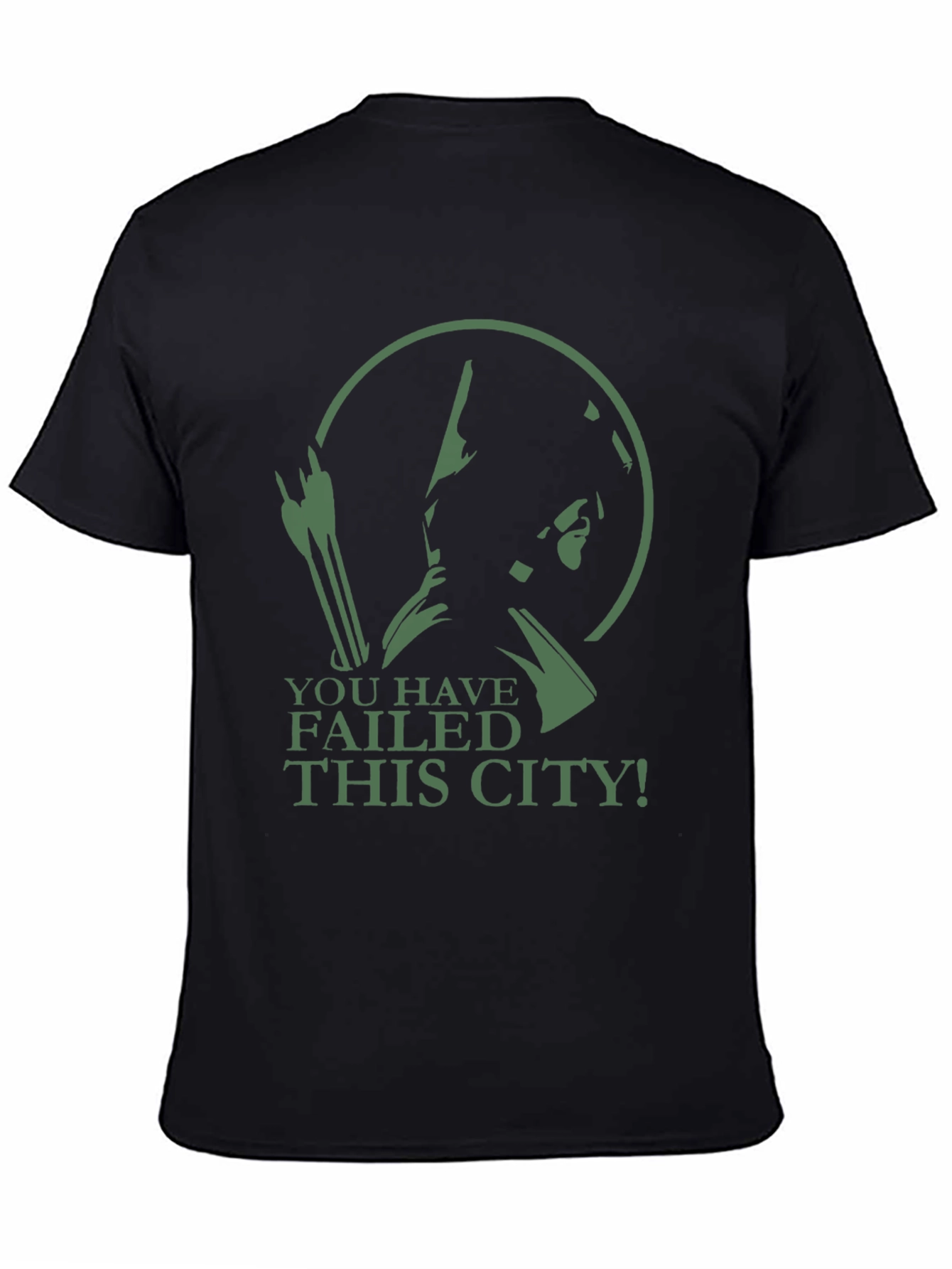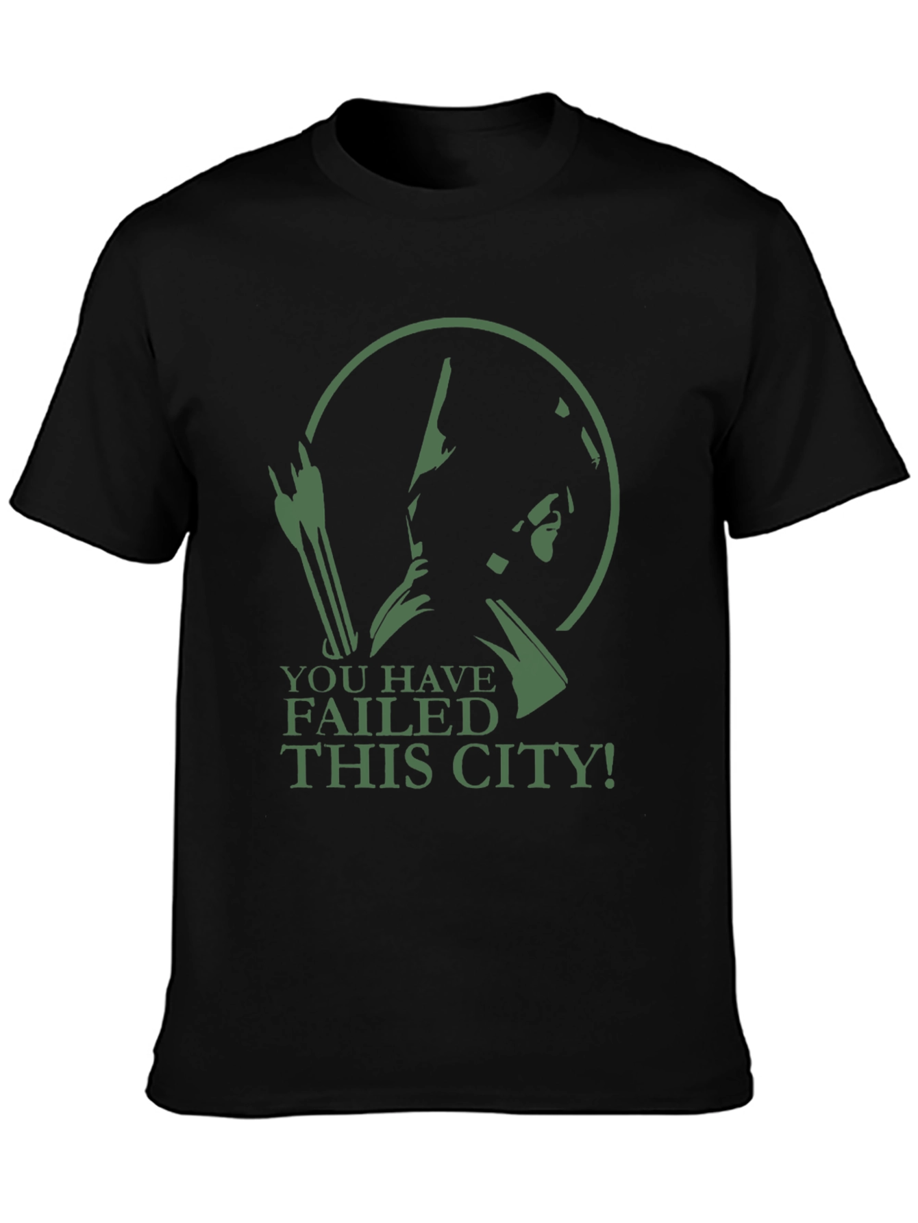 Show your love for the Emerald Archer with this stylish black t-shirt. Featuring a bold green graphic of Green Arrow's iconic silhouette and the memorable quote "You Have Failed This City!", this tee is a must-have for any fan. Made from a comfortable and durable fabric, this shirt is perfect for everyday wear, comic conventions, or binge-watching your favorite superhero show. Make a statement and channel your inner hero with this awesome Green Arrow tee!