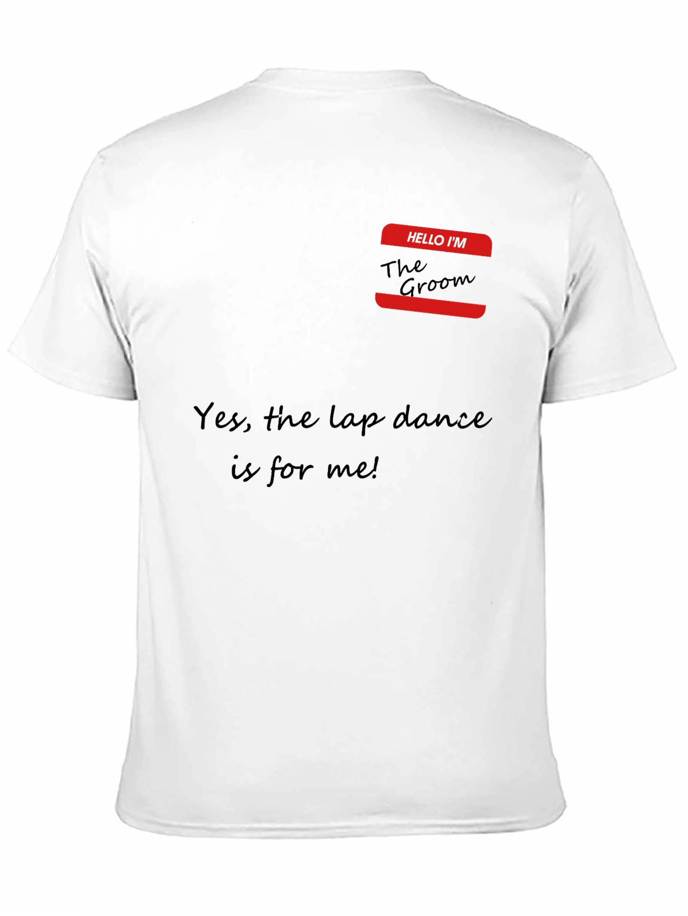 This black t-shirt is perfect for the groom-to-be with a sense of humor. The front features a red name tag design with 'Hello I'm The Groom' printed on it. Below it's a funny message 'Yes, the lap dance is for me!'. Made from a comfortable, soft fabric, this tee is great for bachelor parties, wedding receptions, or casual wear after the big day. It's a fun and lighthearted way to celebrate the groom. Wear it with pride and get ready for some laughs! Grab this memorable tee and make your wedding festivities even more unforgettable. A great gift for any groom!