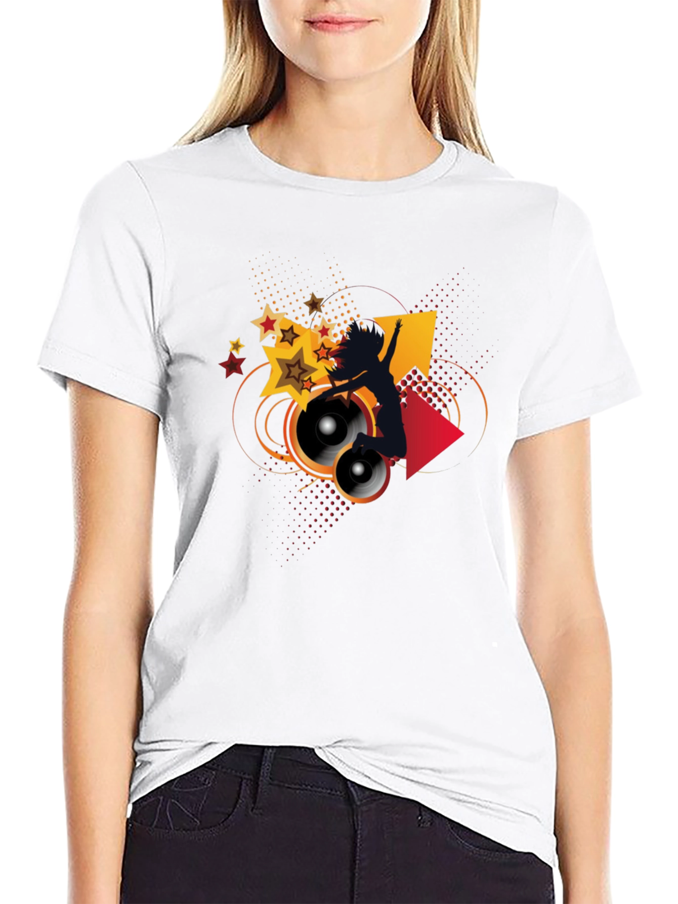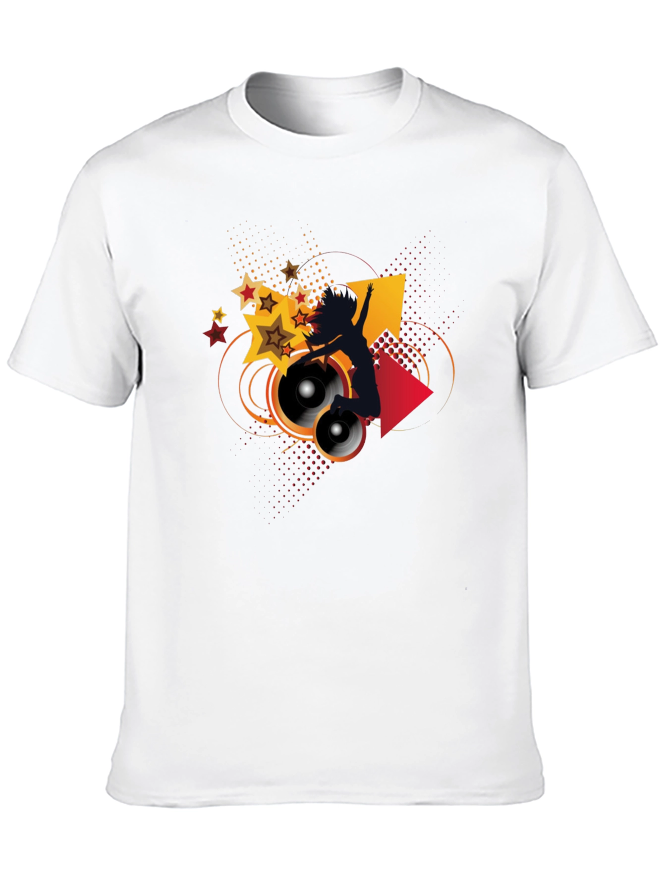 Rock your casual style with this eye-catching black graphic tee. This t-shirt features a vibrant and dynamic design with a silhouette of a person dancing amidst stars, speakers, and geometric shapes. The colorful graphics contrast sharply against the black backdrop, creating a bold and energetic look. Made from a comfortable fabric, this tee is perfect for everyday wear, concerts, or adding a touch of fun to any outfit. Show off your love for music and dance with this unique statement piece. Great for casual outings, parties, or relaxing at home.