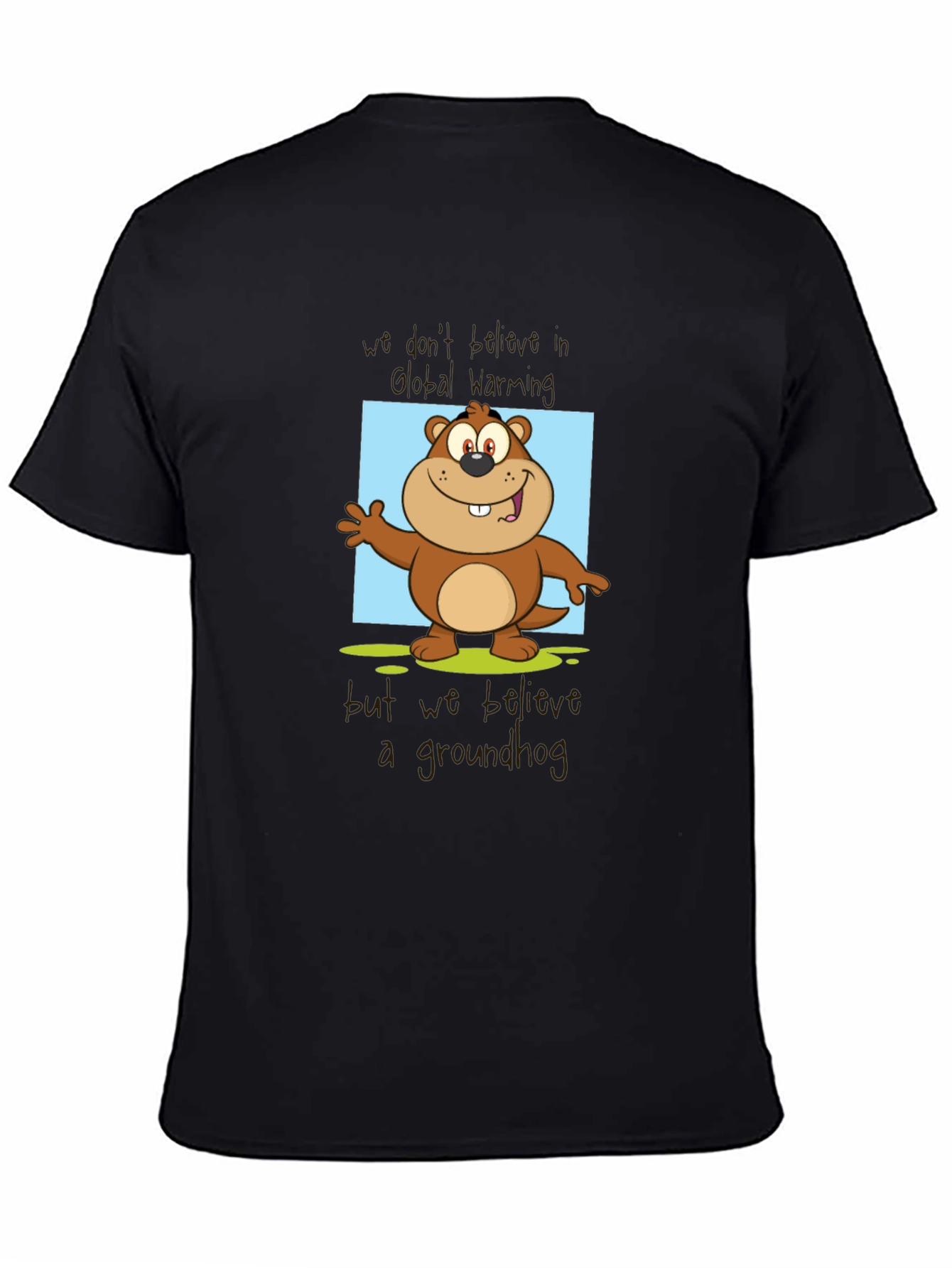 This black t-shirt features a cartoon groundhog design. The groundhog is brown with a friendly smile and is waving. The design has a light blue background with green grass. Perfect for Groundhog Day enthusiasts, this t-shirt offers a comfortable fit and a fun, unique design. Show your support for the furry forecaster in style! Made from soft, breathable fabric, it's ideal for everyday wear. A great conversation starter and a whimsical addition to any wardrobe.