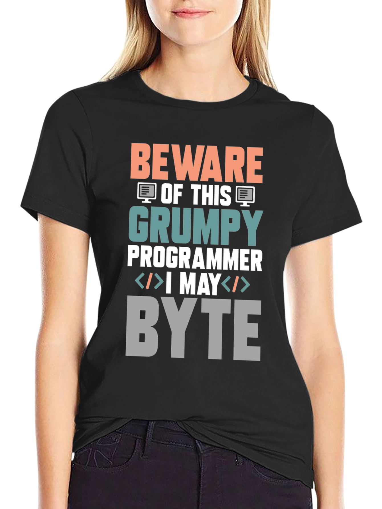 This black t-shirt features a humorous design perfect for programmers with a sense of humor. The shirt reads 'BEWARE OF THIS GRUMPY PROGRAMMER I MAY BYTE' in a combination of orange, teal, and white text. The design includes retro computer monitor graphics, adding a geeky touch. Made from comfortable fabric, this shirt is ideal for casual wear, coding sessions, or tech meetups. It's a great conversation starter and a fun way to express your love for programming. Show off your programmer pride with this unique and eye-catching t-shirt.