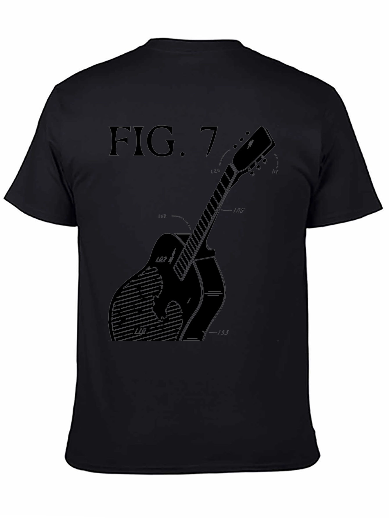 This black t-shirt features a unique and artistic guitar blueprint design. The print showcases a detailed schematic of an acoustic guitar, complete with callouts and markings in a subtle dark gray ink, giving it a vintage and technical aesthetic. Made from what appears to be a soft and comfortable cotton blend, this tee offers both style and wearability. Perfect for musicians, engineers, or anyone who appreciates distinctive graphic tees. Wear it casually with jeans or dress it up with a blazer for a modern, intellectual look. Makes a great gift for the guitar enthusiast in your life.