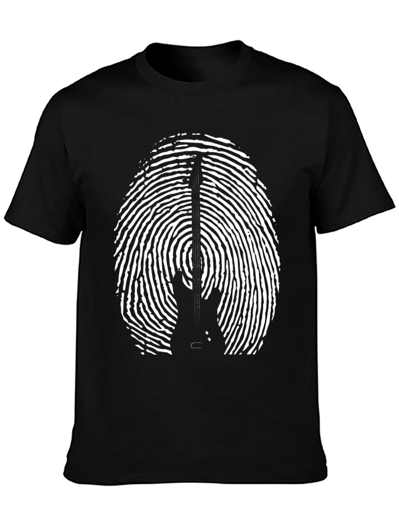 Show off your love for music with this unique black graphic tee. The shirt features a striking white fingerprint design with a guitar silhouette at its core. Made from a soft, comfortable fabric, this tee is perfect for everyday wear or for rocking out at your next concert. The classic fit and short sleeves make it a versatile addition to any wardrobe. Whether you're a musician, a music enthusiast, or simply appreciate eye-catching designs, this shirt is sure to turn heads and spark conversations. Add a touch of musical flair to your style today!