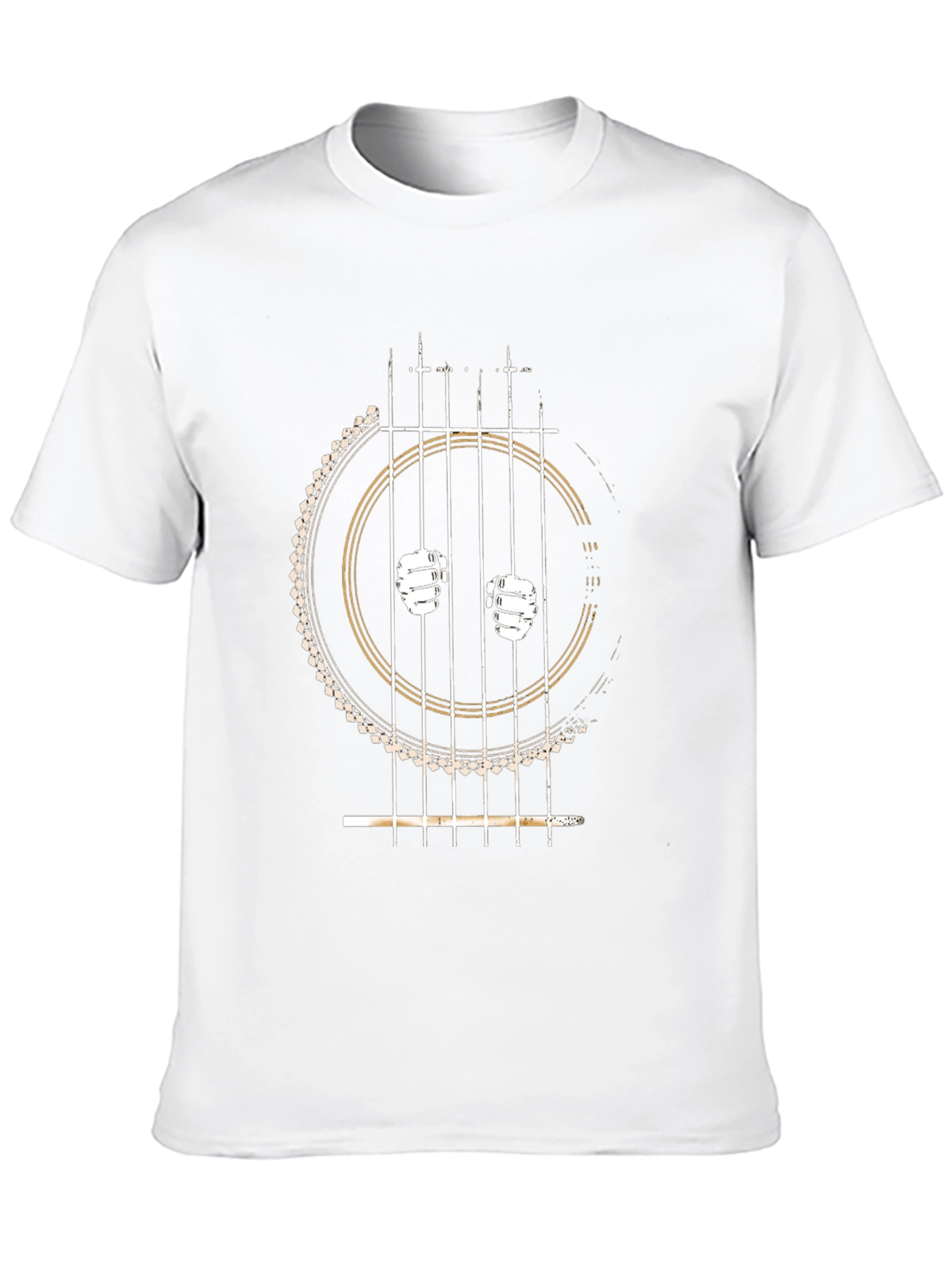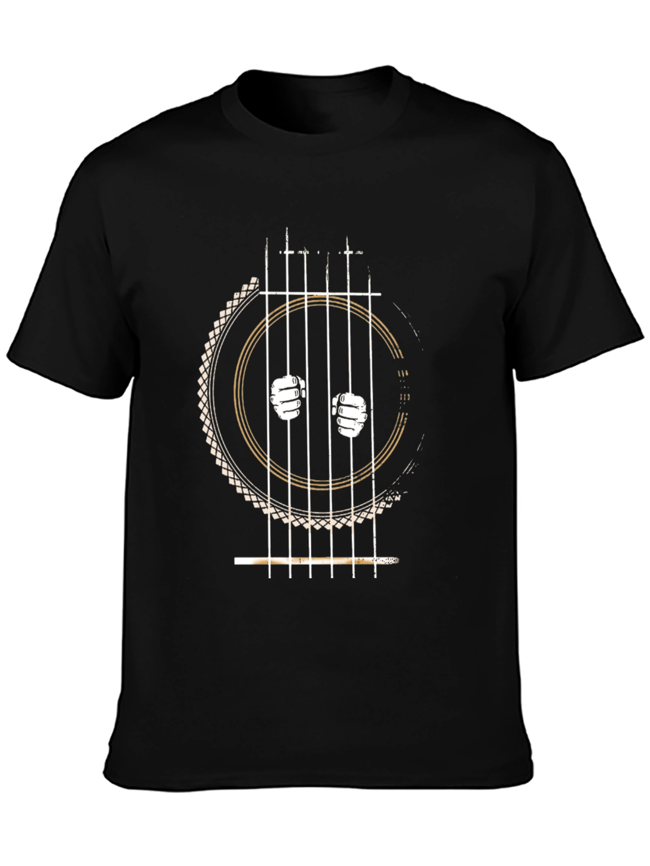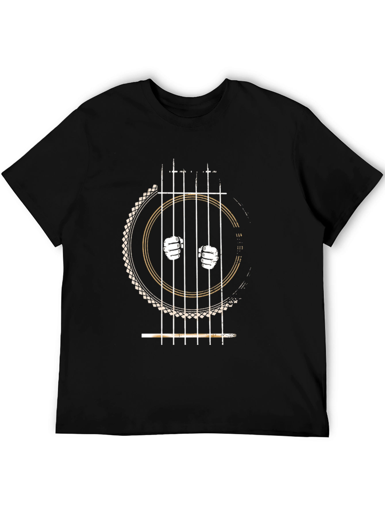 Showcase your love for music and unique style with this eye-catching graphic tee. Featuring a creative design of a guitar with hands seemingly breaking free from behind the strings, this tee is a statement piece. The design is printed on a classic black tee, allowing the white and gold graphics to pop, catching the eye. Made from a soft and comfortable fabric, this t-shirt is perfect for everyday wear. Pair it with jeans or shorts for a casual yet stylish look. This guitar themed tee is great for musicians, music lovers, or anyone who appreciates clever design. It's bound to start conversations!