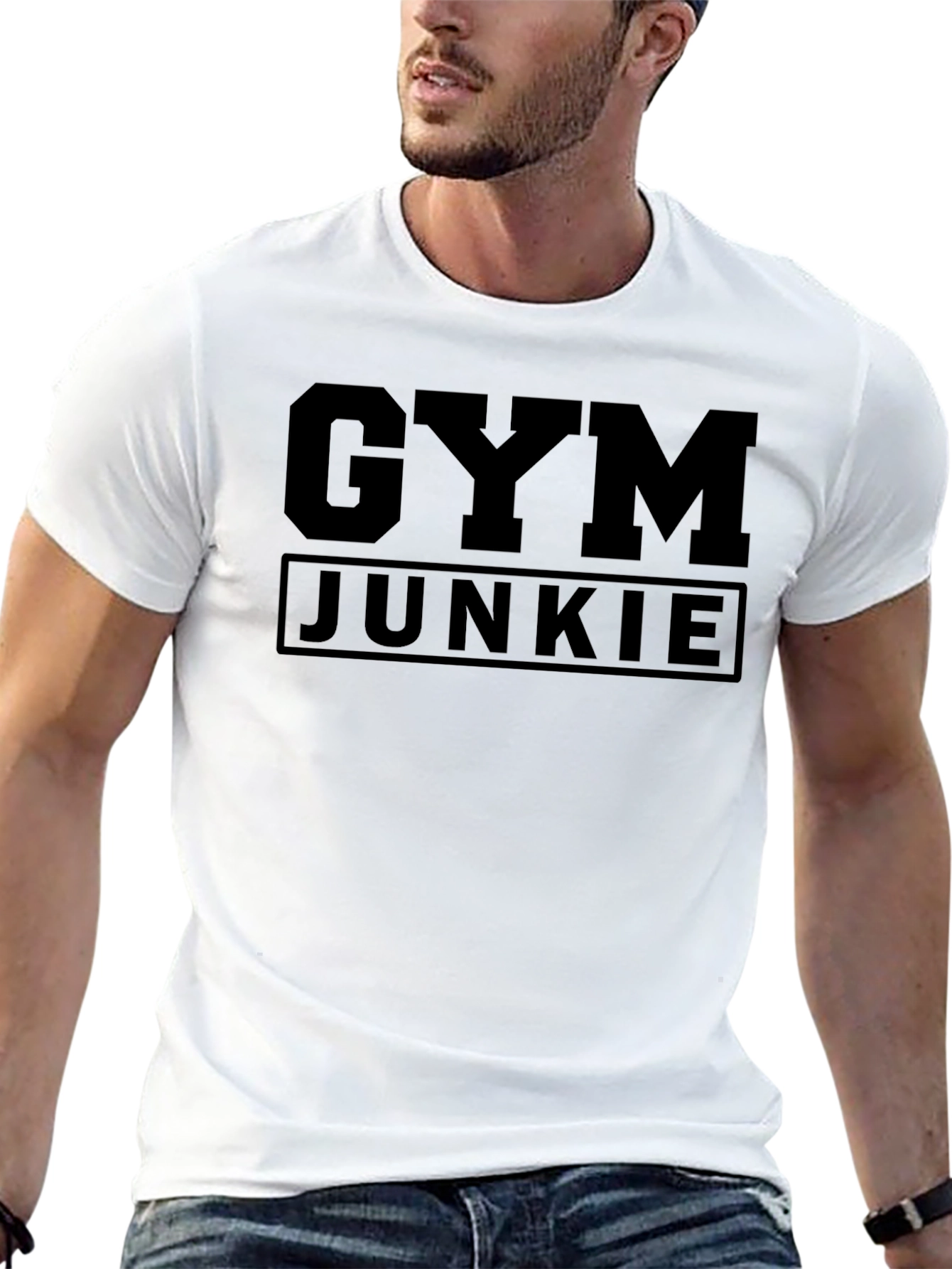 Show your passion for fitness with this stylish black t-shirt. Featuring a bold "GYM JUNKIE" graphic across the chest, this tee is perfect for workouts or casual wear. The classic crew neck and short sleeve design offer a comfortable fit, while the solid black color provides a sleek, versatile look. Made from soft, breathable material, this shirt ensures you stay cool and comfortable whether you're hitting the gym or running errands. Ideal for gym enthusiasts and anyone who loves a sporty, relaxed style. Get yours today and make a statement!