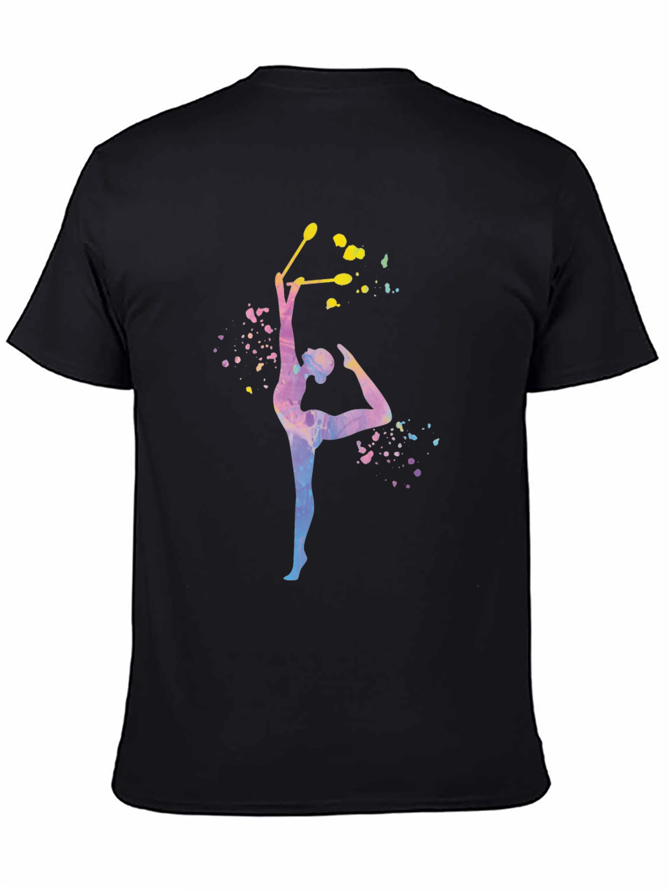 Showcase your passion for artistic gymnastics with this eye-catching black T-shirt. The shirt features a vibrant, watercolor-style graphic of a gymnast gracefully posing with clubs, adding a splash of color to the dark fabric. Crafted from comfortable cotton, this tee is ideal for everyday wear, workouts, or casual outings. The design is perfect for gymnasts, coaches, or fans of the sport. Make a statement with this unique and stylish piece that celebrates the beauty and athleticism of gymnastics. A must-have for any gymnastics enthusiast!