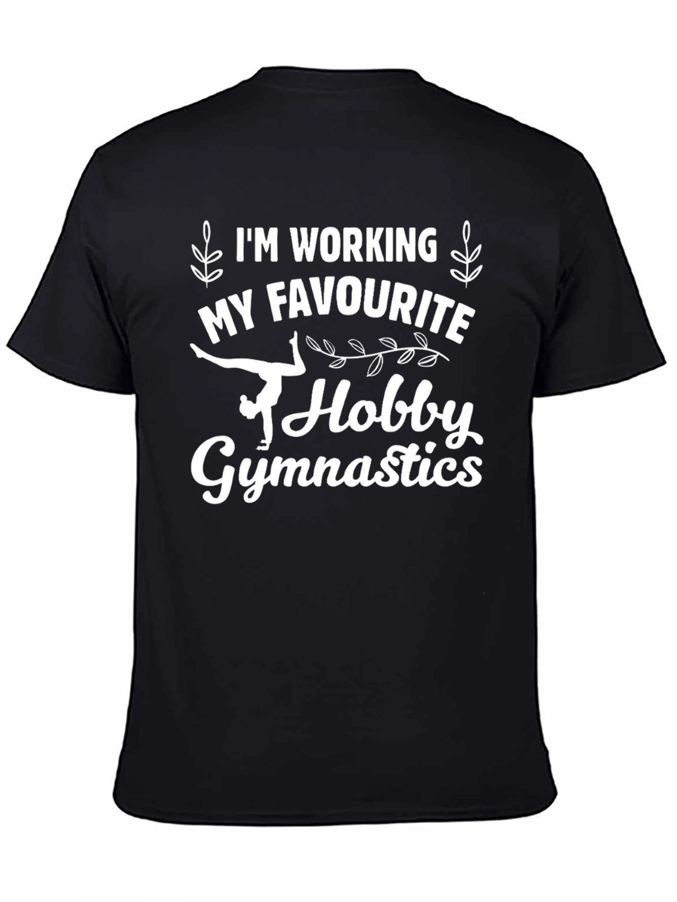 Showcase your love for gymnastics with this stylish black t-shirt! Featuring a bold white graphic, it reads "I'M WORKING MY FAVOURITE HOBBY Gymnastics", complete with whimsical leaf accents and a gymnast silhouette. This tee is made of soft, comfortable fabric, perfect for casual wear or showing off your passion at the gym. Ideal for gymnasts, coaches, or anyone who loves the sport. A unique and fun way to express your interests!