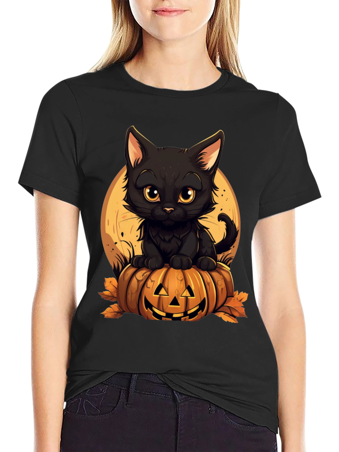 Embrace the spooky season with this charming black t-shirt featuring an adorable black cat perched atop a jack-o'-lantern. The design is set against a soft yellow moon backdrop, creating a festive Halloween vibe. Crafted from comfortable, breathable fabric, this shirt is perfect for casual wear, Halloween parties, or trick-or-treating adventures. The detailed illustration adds a touch of whimsical fun to your wardrobe. Show off your love for cats and Halloween with this unique and eye-catching t-shirt. It's a fantastic addition to your holiday apparel collection.