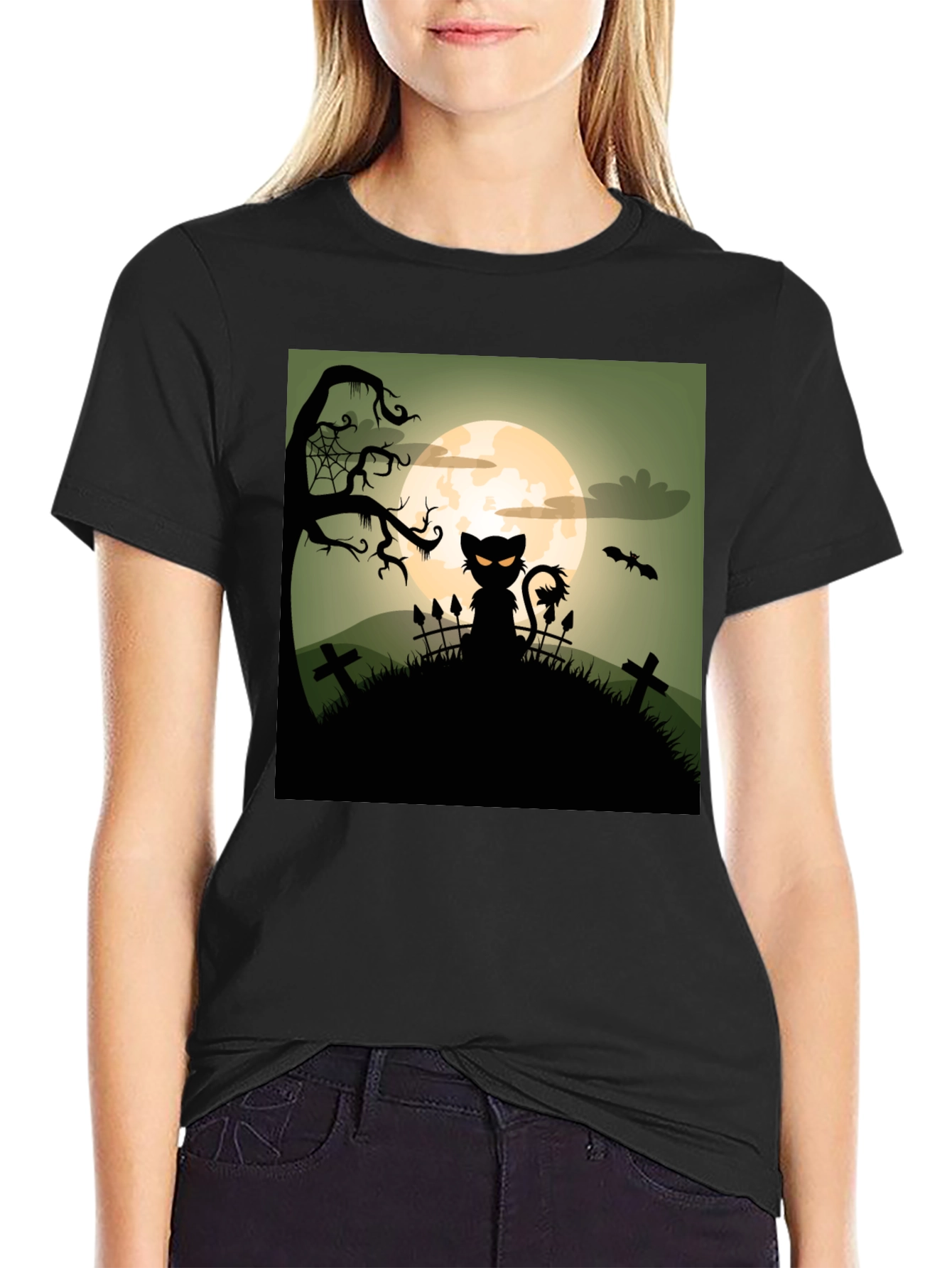 Embrace the spooky season with this Halloween-themed black t-shirt! The design features a silhouette of a black cat sitting atop a hill with crosses and a picket fence, set against a spooky full moon backdrop. A bare tree, clouds, and bats complete the chilling design. It's perfect for Halloween parties, trick-or-treating, or expressing your love for the holiday. The shirt appears to be made of a comfortable material, ideal for everyday wear. Get into the spirit of Halloween with this unique and eye-catching tee!