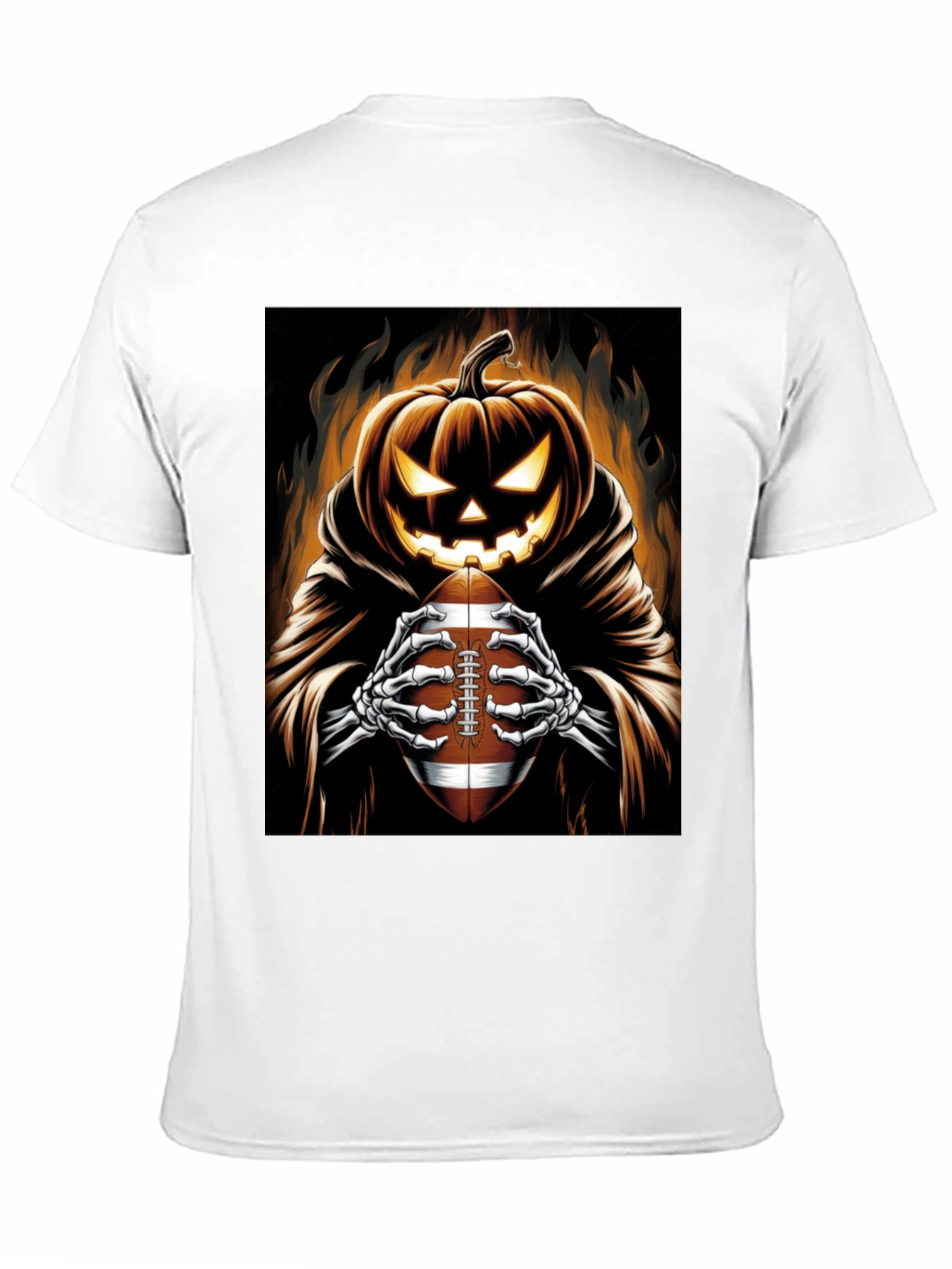 Get ready for Halloween and football season with this unique black t-shirt. The shirt features a vibrant graphic of a spooky jack-o'-lantern in a dark cloak, holding a football. The pumpkin's eerie glow and skeletal hands gripping the ball create a perfect blend of Halloween and sports themes. Made from comfortable fabric, this tee is perfect for casual wear, Halloween parties, or cheering on your favorite team. Show off your Halloween spirit and love for football with this one-of-a-kind t-shirt. Great for game days, costume parties, or everyday wear!